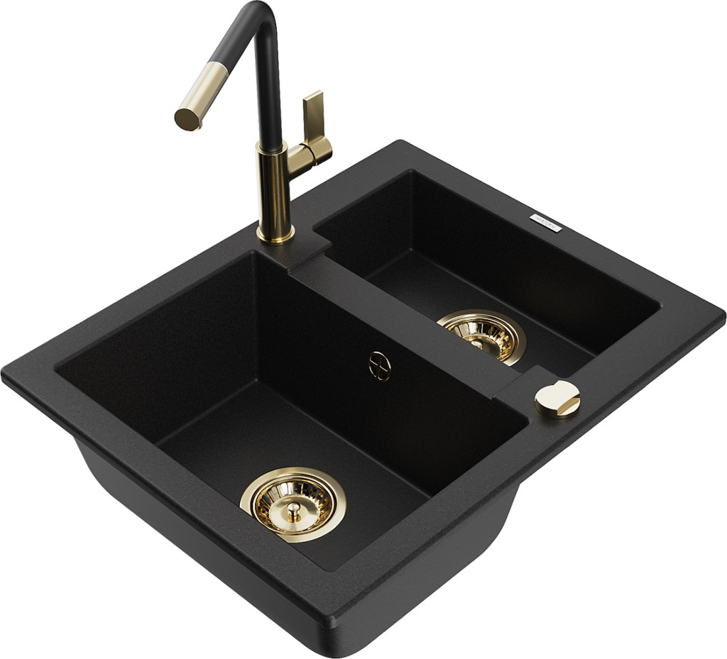 Technické dáta: drez: Rozmer: 582 x 475 x 177 mm Hĺbka komory: 162 mm (väčšia), 102 mm (menšia) Rozmery komory: 395x272 mm (väčšie), 375x182 mm (menšie) Priemer odtoku: ø90 mm Typ: 1,5 komory Typ: Zapustené do pracovnej dosky Čierna farba Povrchová úprava sifónu: zlatá Materiál: žula (80% žulové kamenivo, 20% živice) Prepadový otvor: Áno Otvory: (batérie, automatické) 2 Vysoká odolnosť proti poškriabaniu a zmene farby Odolnosť proti tepelným šokom Ľahko čistiteľný povrch Jeden dodatočný vyfrézovaný otvor na samodierovanie ø35 kuchynská batéria: Materiál: mosadz Farba: Zlatá/Čierna Hlava: Keramická Prevzdušňovač: Áno Typ: Jedna páka Rozsah výtoku: 245 mm Výška batérie: 307 mm(GT) Ean: 5905315063922