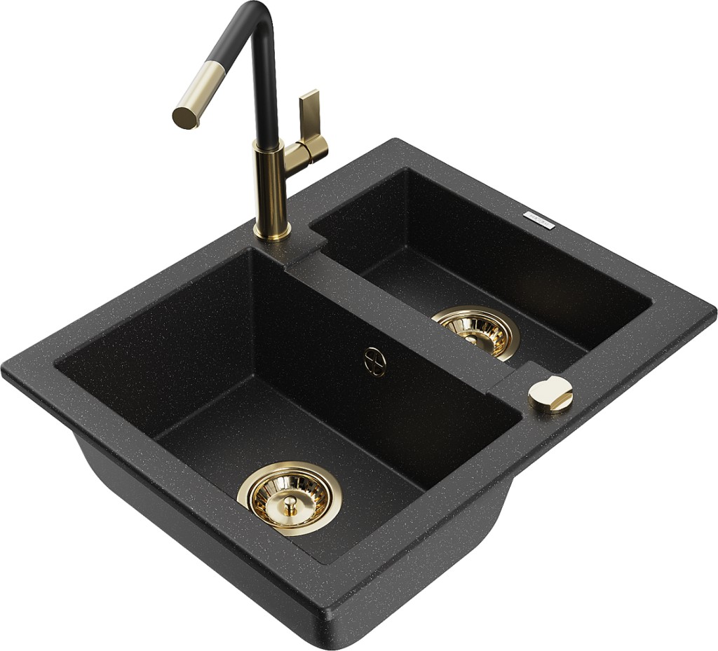 Technické dáta: Drez: Rozmer: 582x475x177 mm Hĺbka komory: 162 mm (väčšia), 102 mm (menšia) Rozmery komory: 395x272 mm (väčšie), 375x182 mm (menšie) Priemer odtoku: ø90 mm Typ: 1,5-komorový Typ: Zapustené do pracovnej dosky Farba: čierna/strieborná metalíza Povrchová úprava sifónu: zlatá Materiál: žula (80% žulové kamenivo 20% živice) Prepadový otvor: Áno Otvory: (batérie, automat) 2 Vysoká odolnosť proti poškriabaniu a zmene farby Odolnosť proti tepelným šokom Povrch pre ľahké čistenie Jeden dodatočný vyfrézovaný otvor na samodierovanie ø35 Kuchynská batéria: Materiál: mosadz Farba: Zlatá/Čierna Hlava: Keramická Perlátor: Áno Typ: Jednopákové Rozsah výtoku: 245 mm Výška batérie: 307 mm(GT) Ean: 5905315063700