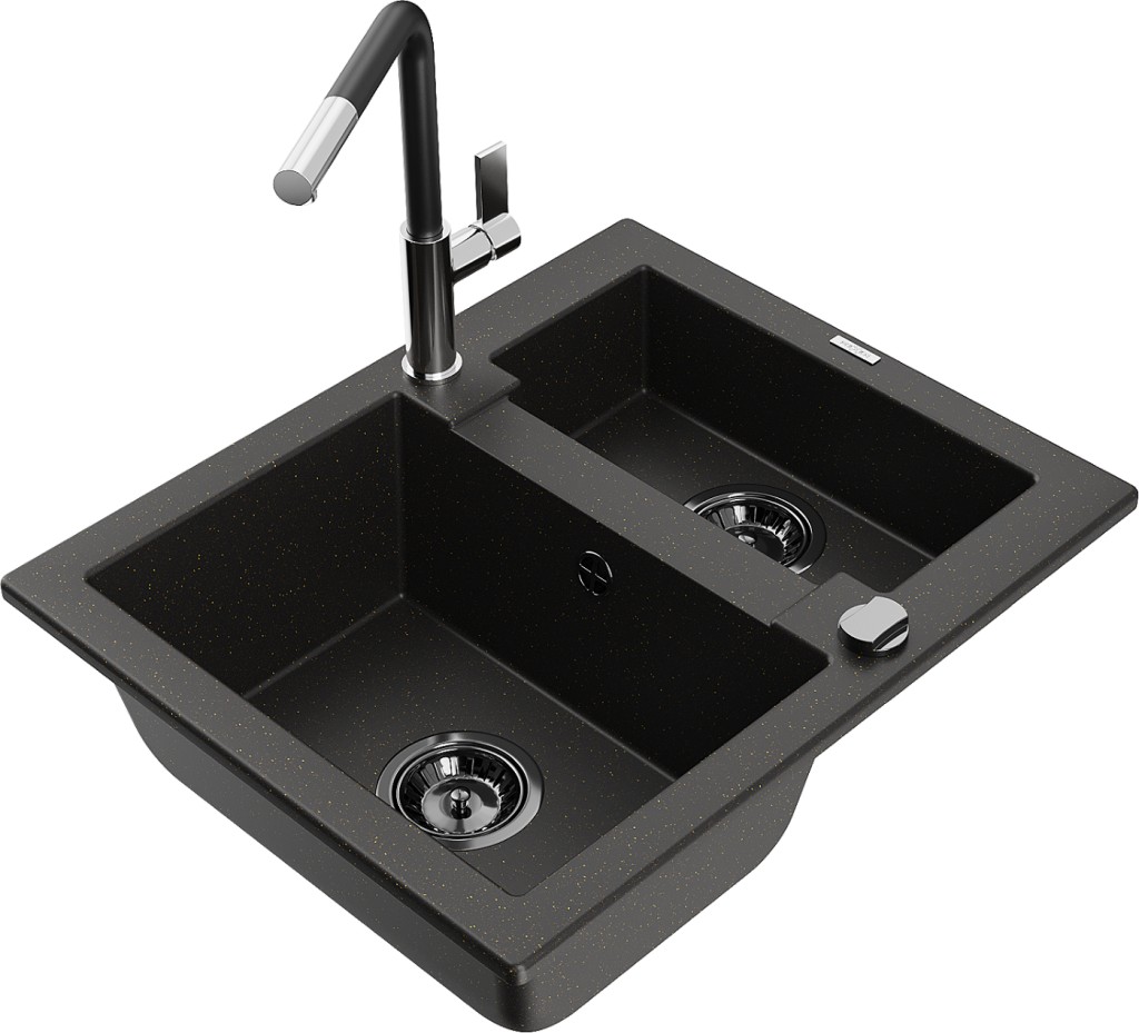Technické dáta: drez: Rozmer: 582 x 475 x 177 mm Hĺbka komory: 162 mm (väčšia), 102 mm (menšia) Rozmery komory: 395x272 mm (väčšie), 375x182 mm (menšie) Priemer odtoku: ø90 mm Typ: 1,5 komory Typ: Zapustené do pracovnej dosky Farba: čierna / zlatá metalíza Povrchová úprava sifónu: čierna Materiál: žula (80% žulové kamenivo, 20% živice) Prepadový otvor: Áno Otvory: (batérie, automatické) 2 Vysoká odolnosť proti poškriabaniu a zmene farby Odolnosť proti tepelným šokom Ľahko čistiteľný povrch Jeden dodatočný vyfrézovaný otvor na samodierovanie ø35 kuchynská batéria: Materiál: mosadz Farba: chróm/čierna Hlava: Keramická Prevzdušňovač: Áno Typ: Jedna páka Rozsah výtoku: 245 mm Výška batérie: 307 mm(GT) Ean: 5905315063755