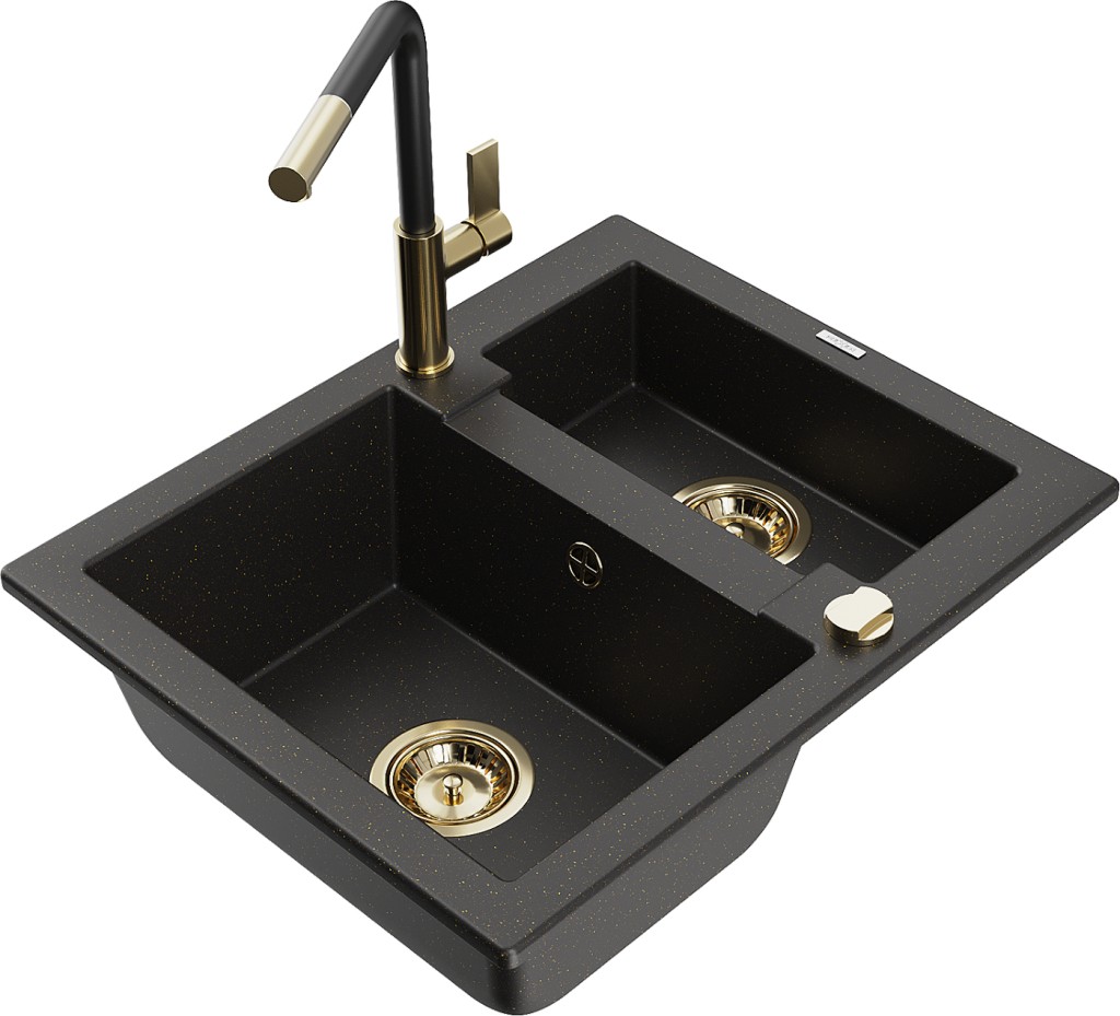 Technické dáta: drez: Rozmer: 582 x 475 x 177 mm Hĺbka komory: 162 mm (väčšia), 102 mm (menšia) Rozmery komory: 395x272 mm (väčšie), 375x182 mm (menšie) Priemer odtoku: ø90 mm Typ: 1,5 komory Typ: Zapustené do pracovnej dosky Farba: čierna / zlatá metalíza Povrchová úprava sifónu: zlatá Materiál: žula (80% žulové kamenivo, 20% živice) Prepadový otvor: Áno Otvory: (batérie, automatické) 2 Vysoká odolnosť proti poškriabaniu a zmene farby Odolnosť proti tepelným šokom Ľahko čistiteľný povrch Jeden dodatočný vyfrézovaný otvor na samodierovanie ø35 kuchynská batéria: Materiál: mosadz Farba: Zlatá/Čierna Hlava: Keramická Prevzdušňovač: Áno Typ: Jedna páka Rozsah výtoku: 245 mm Výška batérie: 307 mm(GT) Ean: 5905315063762