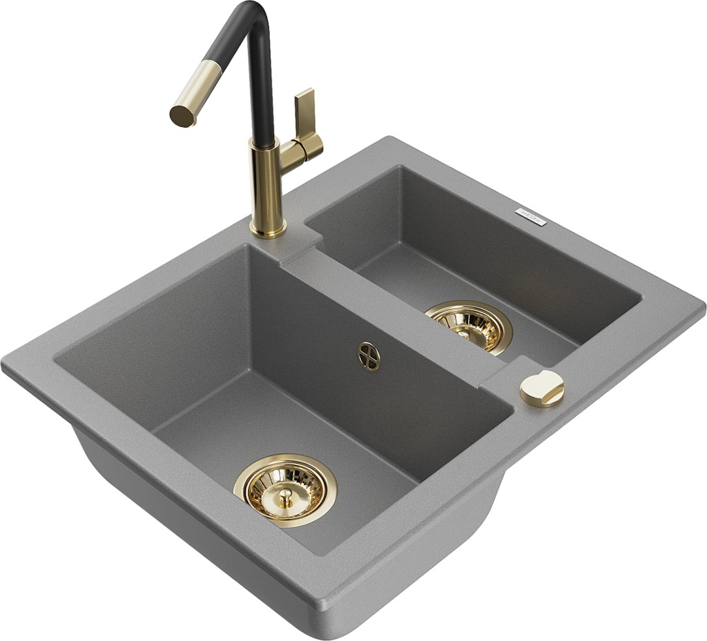 Technické dáta: drez: Rozmer: 582 x 475 x 177 mm Hĺbka komory: 162 mm (väčšia), 102 mm (menšia) Rozmery komory: 395x272 mm (väčšie), 375x182 mm (menšie) Priemer odtoku: ø90 mm Typ: 1,5 komory Typ: Zapustené do pracovnej dosky Šedá farba Povrchová úprava sifónu: zlatá Materiál: žula (80% žulové kamenivo, 20% živice) Prepadový otvor: Áno Otvory: (batérie, automatické) 2 Vysoká odolnosť proti poškriabaniu a zmene farby Odolnosť proti tepelným šokom Ľahko čistiteľný povrch Jeden dodatočný vyfrézovaný otvor na samodierovanie ø35 kuchynská batéria: Materiál: mosadz Farba: Zlatá/Čierna Hlava: Keramická Prevzdušňovač: Áno Typ: Jedna páka Rozsah výtoku: 245 mm Výška batérie: 307 mm(GT) Ean: 5905315063649