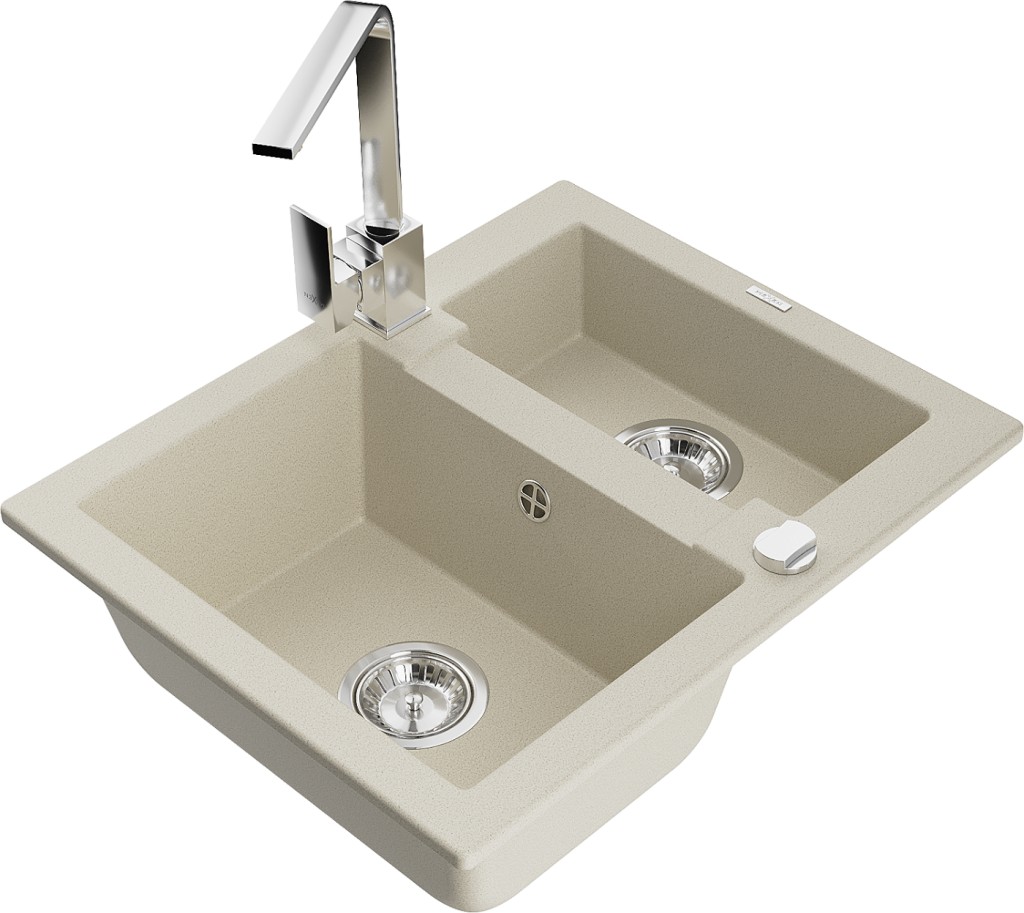 Technické dáta: drez: Rozmer: 582 x 475 x 177 mm Hĺbka komory: 162 mm (väčšia), 102 mm (menšia) Rozmery komory: 395x272 mm (väčšie), 375x182 mm (menšie) Priemer odtoku: ø90 mm Typ: 1,5 komory Typ: Zapustené do pracovnej dosky Farba béžová Povrchová úprava sifónu: Chrome Materiál: žula (80% žulové kamenivo, 20% živice) Prepadový otvor: Áno Otvory: (batérie, automatické) 2 Vysoká odolnosť proti poškriabaniu a zmene farby Odolnosť proti tepelným šokom Ľahko čistiteľný povrch Jeden dodatočný vyfrézovaný otvor na samodierovanie ø35 kuchynská batéria: Materiál: mosadz Farba: Chrome Hlava: Keramická Prevzdušňovač: Áno Typ: Jedna páka Výška batérie: 290 mm Rozsah výtoku: 220 mm(GT) Ean: 5905315021731