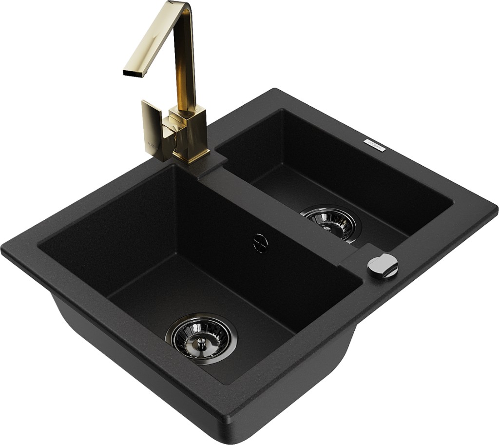 Technické dáta: drez: Rozmer: 582 x 475 x 177 mm Hĺbka komory: 162 mm (väčšia), 102 mm (menšia) Rozmery komory: 395x272 mm (väčšie), 375x182 mm (menšie) Priemer odtoku: ø90 mm Typ: 1,5 komory Typ: Zapustené do pracovnej dosky Čierna farba Povrchová úprava sifónu: čierna Materiál: žula (80% žulové kamenivo, 20% živice) Prepadový otvor: Áno Otvory: (batérie, automatické) 2 Vysoká odolnosť proti poškriabaniu a zmene farby Odolnosť proti tepelným šokom Ľahko čistiteľný povrch Jeden dodatočný vyfrézovaný otvor na samodierovanie ø35 kuchynská batéria: Materiál: mosadz Farba: Zlatá Hlava: Keramická Prevzdušňovač: Áno Typ: Jedna páka Výška batérie: 290 mm Rozsah výtoku: 220 mm(GT) Ean: 5905315021984