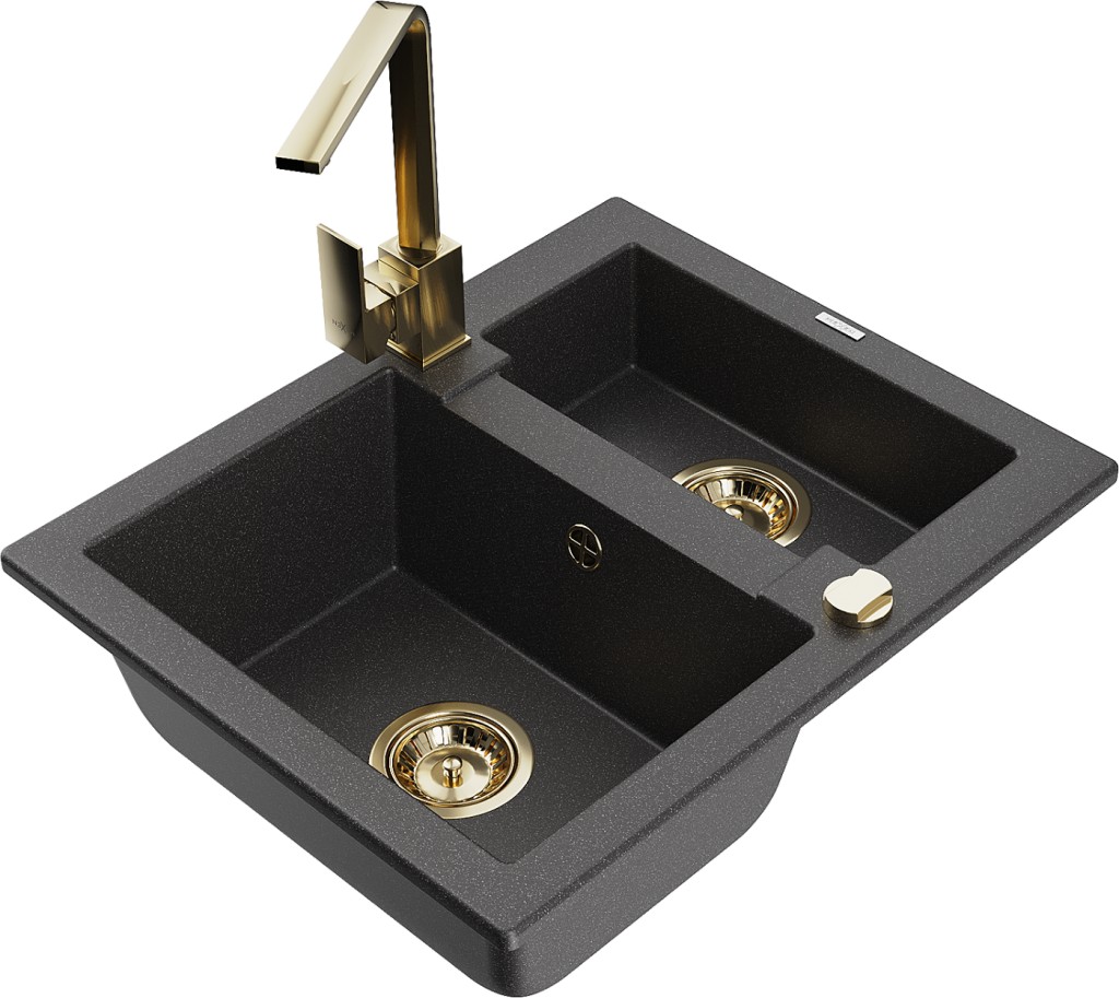 Technické dáta: drez: Rozmer: 582 x 475 x 177 mm Hĺbka komory: 162 mm (väčšia), 102 mm (menšia) Rozmery komory: 395x272 mm (väčšie), 375x182 mm (menšie) Priemer odtoku: ø90 mm Typ: 1,5 komory Typ: Zapustené do pracovnej dosky Farba: Škvrnitá čierna Povrchová úprava sifónu: zlatá Materiál: žula (80% žulové kamenivo, 20% živice) Prepadový otvor: Áno Otvory: (batérie, automatické) 2 Vysoká odolnosť proti poškriabaniu a zmene farby Odolnosť proti tepelným šokom Ľahko čistiteľný povrch Jeden dodatočný vyfrézovaný otvor na samodierovanie ø35 kuchynská batéria: Materiál: mosadz Farba: Zlatá Hlava: Keramická Prevzdušňovač: Áno Typ: Jedna páka Výška batérie: 290 mm Rozsah výtoku: 220 mm(GT) Ean: 5905315021922