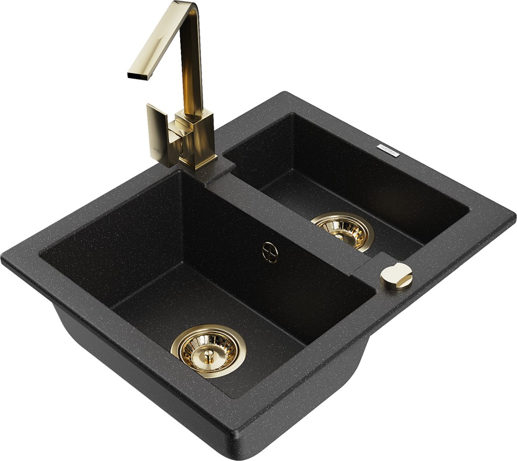 Technické dáta: drez: Rozmer: 582 x 475 x 177 mm Hĺbka komory: 162 mm (väčšia), 102 mm (menšia) Rozmery komory: 395x272 mm (väčšie), 375x182 mm (menšie) Priemer odtoku: ø90 mm Typ: 1,5 komory Typ: Zapustené do pracovnej dosky Farba: čierna/strieborná metalíza Povrchová úprava sifónu: zlatá Materiál: žula (80% žulové kamenivo, 20% živice) Prepadový otvor: Áno Otvory: (batérie, automatické) 2 Vysoká odolnosť proti poškriabaniu a zmene farby Odolnosť proti tepelným šokom Ľahko čistiteľný povrch Jeden dodatočný vyfrézovaný otvor na samodierovanie ø35 kuchynská batéria: Materiál: mosadz Farba: Zlatá Hlava: Keramická Prevzdušňovač: Áno Typ: Jedna páka Výška batérie: 290 mm Rozsah výtoku: 220 mm(GT) Ean: 5905315021830