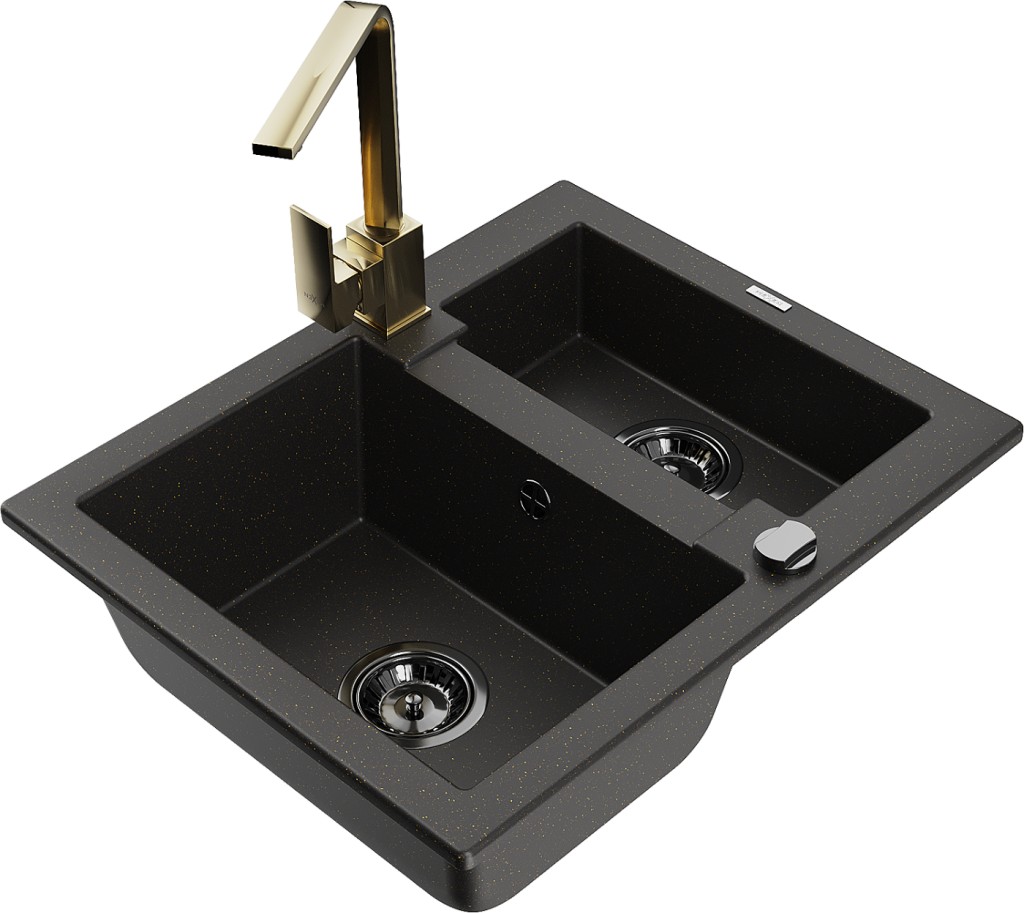 Technické dáta: drez: Rozmer: 582 x 475 x 177 mm Hĺbka komory: 162 mm (väčšia), 102 mm (menšia) Rozmery komory: 395x272 mm (väčšie), 375x182 mm (menšie) Priemer odtoku: ø90 mm Typ: 1,5 komory Typ: Zapustené do pracovnej dosky Farba: čierna / zlatá metalíza Povrchová úprava sifónu: čierna Materiál: žula (80% žulové kamenivo, 20% živice) Prepadový otvor: Áno Otvory: (batérie, automatické) 2 Vysoká odolnosť proti poškriabaniu a zmene farby Odolnosť proti tepelným šokom Ľahko čistiteľný povrch Jeden dodatočný vyfrézovaný otvor na samodierovanie ø35 kuchynská batéria: Materiál: mosadz Farba: Zlatá Hlava: Keramická Prevzdušňovač: Áno Typ: Jedna páka Výška batérie: 290 mm Rozsah výtoku: 220 mm(GT) Ean: 5905315021885