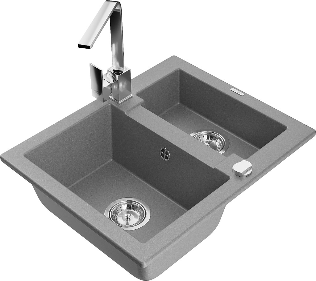 Technické dáta: drez: Rozmer: 582 x 475 x 177 mm Hĺbka komory: 162 mm (väčšia), 102 mm (menšia) Rozmery komory: 395x272 mm (väčšie), 375x182 mm (menšie) Priemer odtoku: ø90 mm Typ: 1,5 komory Typ: Zapustené do pracovnej dosky Šedá farba Povrchová úprava sifónu: Chrome Materiál: žula (80% žulové kamenivo, 20% živice) Prepadový otvor: Áno Otvory: (batérie, automatické) 2 Vysoká odolnosť proti poškriabaniu a zmene farby Odolnosť proti tepelným šokom Ľahko čistiteľný povrch Jeden dodatočný vyfrézovaný otvor na samodierovanie ø35 kuchynská batéria: Materiál: mosadz Farba: Chrome Hlava: Keramická Prevzdušňovač: Áno Typ: Jedna páka Výška batérie: 290 mm Rozsah výtoku: 220 mm(GT) Ean: 5905315021779