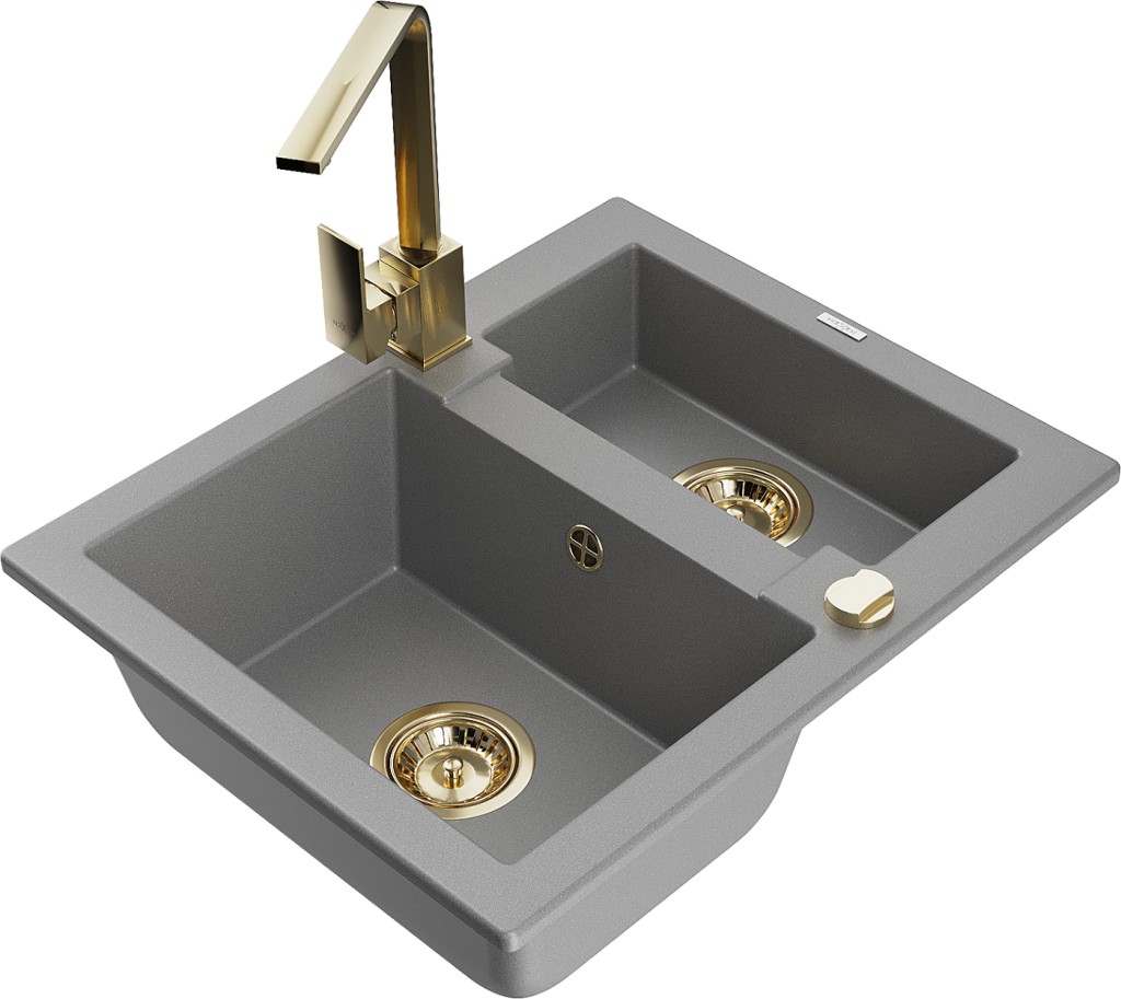 Technické dáta: drez: Rozmer: 582 x 475 x 177 mm Hĺbka komory: 162 mm (väčšia), 102 mm (menšia) Rozmery komory: 395x272 mm (väčšie), 375x182 mm (menšie) Priemer odtoku: ø90 mm Typ: 1,5 komory Typ: Zapustené do pracovnej dosky Šedá farba Povrchová úprava sifónu: zlatá Materiál: žula (80% žulové kamenivo, 20% živice) Prepadový otvor: Áno Otvory: (batérie, automatické) 2 Vysoká odolnosť proti poškriabaniu a zmene farby Odolnosť proti tepelným šokom Ľahko čistiteľný povrch Jeden dodatočný vyfrézovaný otvor na samodierovanie ø35 kuchynská batéria: Materiál: mosadz Farba: Zlatá Hlava: Keramická Prevzdušňovač: Áno Typ: Jedna páka Výška batérie: 290 mm Rozsah výtoku: 220 mm(GT) Ean: 5905315021786