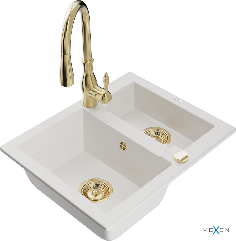Technické dáta: drez: Rozmer: 582 x 475 x 177 mm Hĺbka komory: 162 mm (väčšia), 102 mm (menšia) Rozmery komory: 395x272 mm (väčšie), 375x182 mm (menšie) Priemer odtoku: ø90 mm Typ: 1,5 komory Typ: Zapustené do pracovnej dosky biela farba Povrchová úprava sifónu: zlatá Materiál: žula (80% žulové kamenivo, 20% živice) Prepadový otvor: Áno Otvory: (batérie, automatické) 2 Vysoká odolnosť proti poškriabaniu a zmene farby Odolnosť proti tepelným šokom Ľahko čistiteľný povrch Jeden dodatočný vyfrézovaný otvor na samodierovanie ø35 kuchynská batéria: Materiál: mosadz Farba: Zlatá Hlava: Keramická Prevzdušňovač: Áno Typ: Jedna páka Výška batérie: 410 mm Rozsah výtoku: 231 mm(GT) Ean: 5905315037060