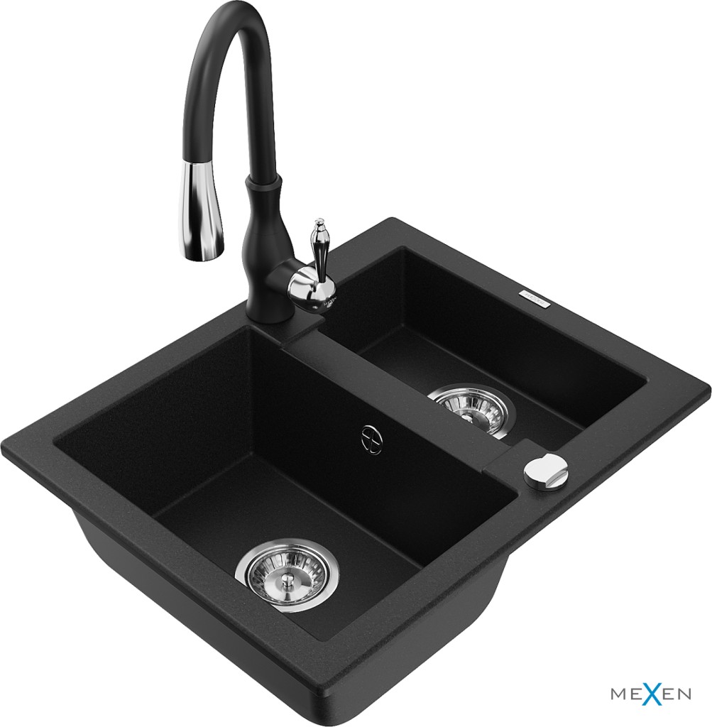 Technické dáta: drez: Rozmer: 582 x 475 x 177 mm Hĺbka komory: 162 mm (väčšia), 102 mm (menšia) Rozmery komory: 395x272 mm (väčšie), 375x182 mm (menšie) Priemer odtoku: ø90 mm Typ: 1,5 komory Typ: Zapustené do pracovnej dosky Čierna farba Povrchová úprava sifónu: Chrome Materiál: žula (80% žulové kamenivo, 20% živice) Prepadový otvor: Áno Otvory: (batérie, automatické) 2 Vysoká odolnosť proti poškriabaniu a zmene farby Odolnosť proti tepelným šokom Ľahko čistiteľný povrch Jeden dodatočný vyfrézovaný otvor na samodierovanie ø35 kuchynská batéria: Materiál: mosadz Čierna farba Hlava: Keramická Prevzdušňovač: Áno Typ: Jedna páka Výška batérie: 410 mm Rozsah výtoku: 231 mm(GT) Ean: 5905315037343
