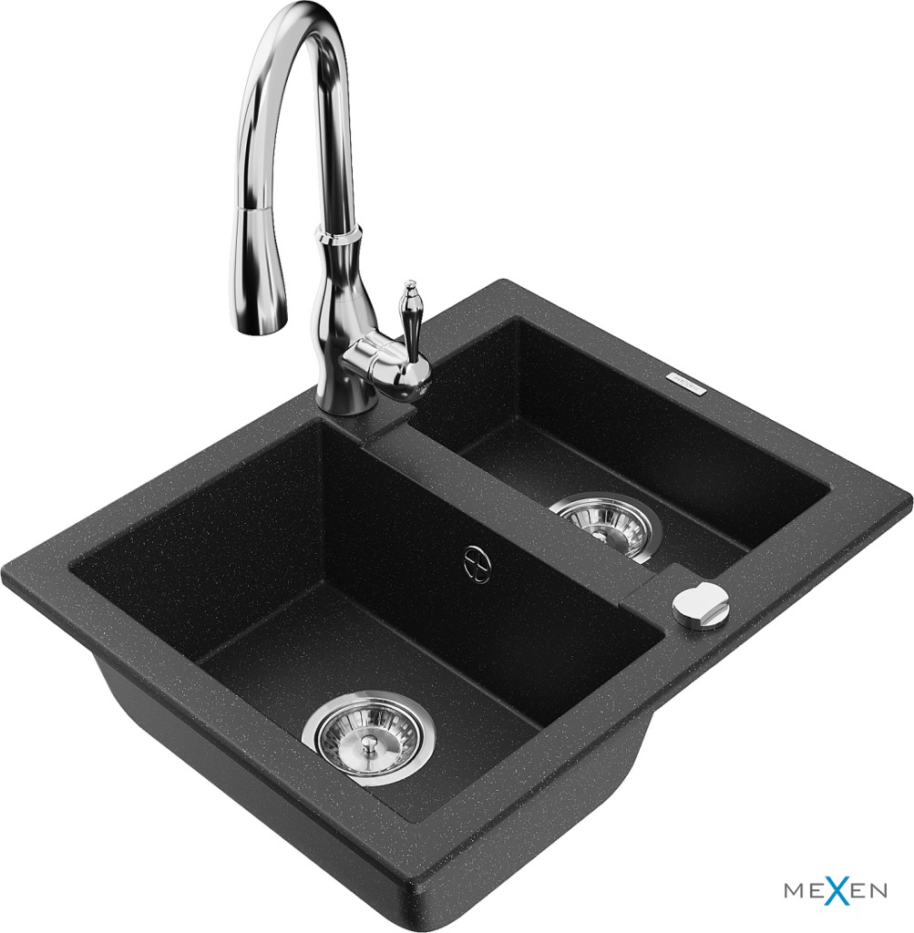 Technické dáta: drez: Rozmer: 582 x 475 x 177 mm Hĺbka komory: 162 mm (väčšia), 102 mm (menšia) Rozmery komory: 395x272 mm (väčšie), 375x182 mm (menšie) Priemer odtoku: ø90 mm Typ: 1,5 komory Typ: Zapustené do pracovnej dosky Farba: čierna/strieborná metalíza Povrchová úprava sifónu: Chrome Materiál: žula (80% žulové kamenivo, 20% živice) Prepadový otvor: Áno Otvory: (batérie, automatické) 2 Vysoká odolnosť proti poškriabaniu a zmene farby Odolnosť proti tepelným šokom Ľahko čistiteľný povrch Jeden dodatočný vyfrézovaný otvor na samodierovanie ø35 kuchynská batéria: Materiál: mosadz Farba: Chrome Hlava: Keramická Prevzdušňovač: Áno Typ: Jedna páka Výška batérie: 410 mm Rozsah výtoku: 231 mm(GT) Ean: 5905315037176