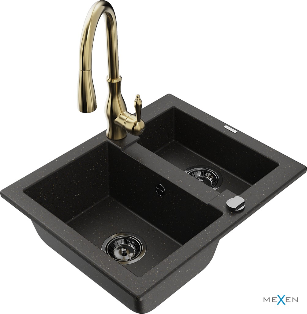 Technické dáta: drez: Rozmer: 582 x 475 x 177 mm Hĺbka komory: 162 mm (väčšia), 102 mm (menšia) Rozmery komory: 395x272 mm (väčšie), 375x182 mm (menšie) Priemer odtoku: ø90 mm Typ: 1,5 komory Typ: Zapustené do pracovnej dosky Farba: čierna / zlatá metalíza Povrchová úprava sifónu: čierna Materiál: žula (80% žulové kamenivo, 20% živice) Prepadový otvor: Áno Otvory: (batérie, automatické) 2 Vysoká odolnosť proti poškriabaniu a zmene farby Odolnosť proti tepelným šokom Ľahko čistiteľný povrch Jeden dodatočný vyfrézovaný otvor na samodierovanie ø35 kuchynská batéria: Materiál: mosadz Farba: Zlatá Hlava: Keramická Prevzdušňovač: Áno Typ: Jedna páka Výška batérie: 410 mm Rozsah výtoku: 231 mm(GT) Ean: 5905315037237
