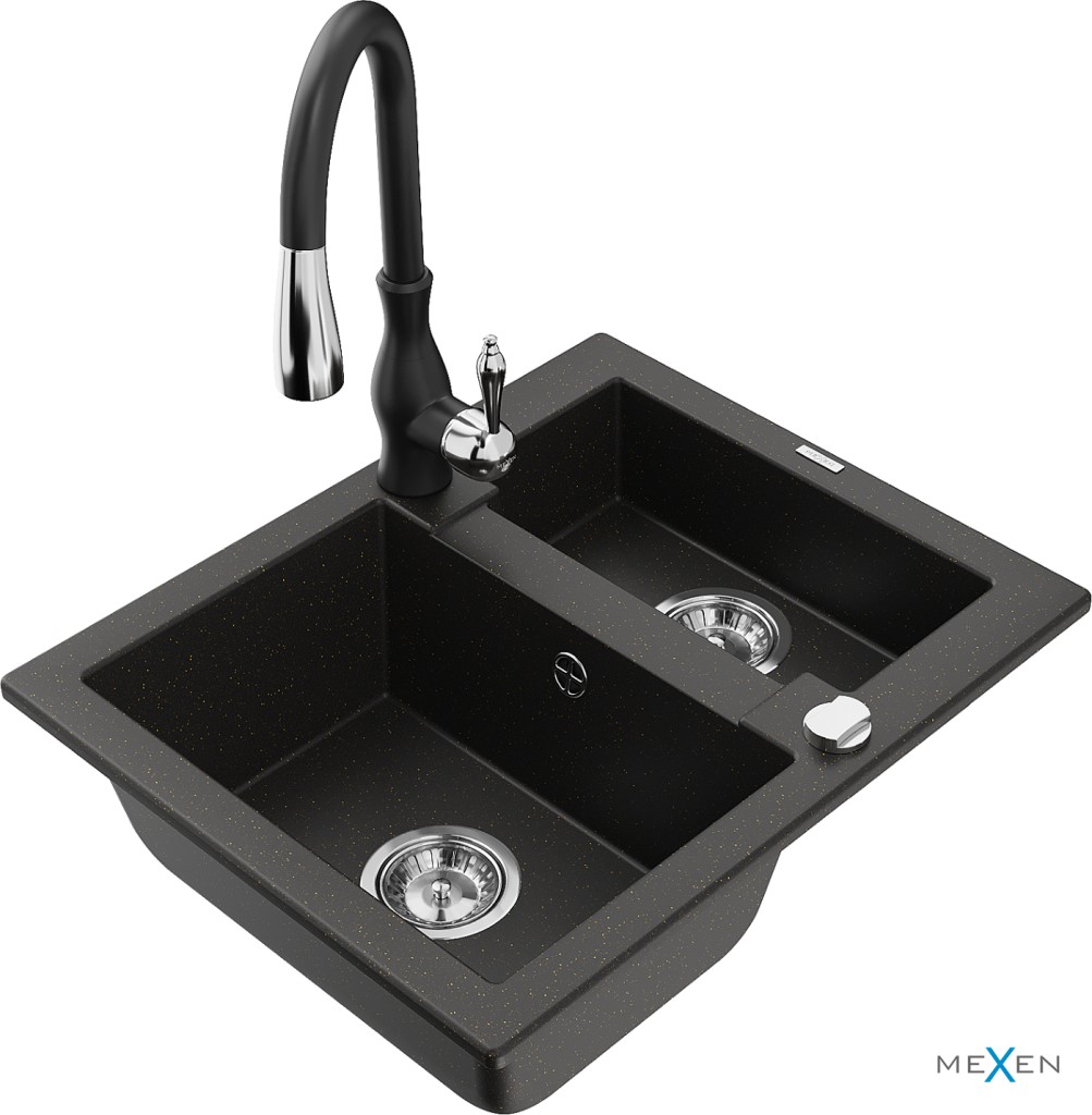 Technické dáta: drez: Rozmer: 582 x 475 x 177 mm Hĺbka komory: 162 mm (väčšia), 102 mm (menšia) Rozmery komory: 395x272 mm (väčšie), 375x182 mm (menšie) Priemer odtoku: ø90 mm Typ: 1,5 komory Typ: Zapustené do pracovnej dosky Farba: čierna / zlatá metalíza Povrchová úprava sifónu: Chrome Materiál: žula (80% žulové kamenivo, 20% živice) Prepadový otvor: Áno Otvory: (batérie, automatické) 2 Vysoká odolnosť proti poškriabaniu a zmene farby Odolnosť proti tepelným šokom Ľahko čistiteľný povrch Jeden dodatočný vyfrézovaný otvor na samodierovanie ø35 kuchynská batéria: Materiál: mosadz Čierna farba Hlava: Keramická Prevzdušňovač: Áno Typ: Jedna páka Výška batérie: 410 mm Rozsah výtoku: 231 mm(GT) Ean: 5905315037244
