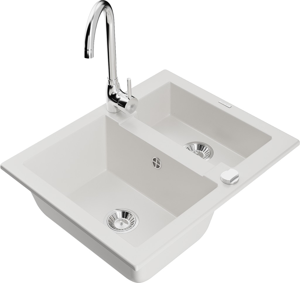 Technické dáta: drez: Rozmer: 582 x 475 x 177 mm Hĺbka komory: 162 mm (väčšia), 102 mm (menšia) Rozmery komory: 395x272 mm (väčšie), 375x182 mm (menšie) Priemer odtoku: ø90 mm Typ: 1,5 komory Typ: Zapustené do pracovnej dosky biela farba Povrchová úprava sifónu: Chrome Materiál: žula (80% žulové kamenivo, 20% živice) Prepadový otvor: Áno Otvory: (batérie, automatické) 2 Vysoká odolnosť proti poškriabaniu a zmene farby Odolnosť proti tepelným šokom Ľahko čistiteľný povrch Jeden dodatočný vyfrézovaný otvor na samodierovanie ø35 kuchynská batéria: Materiál: mosadz Farba: Chrome Hlava: Keramická Prevzdušňovač: Áno Typ: Jedna páka Výška batérie: 335 mm Rozsah výtoku: 180 mm (GT) Ean: 5905315016577
