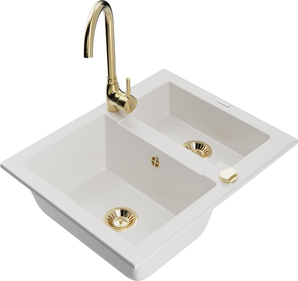 Technické dáta: drez: Rozmer: 582 x 475 x 177 mm Hĺbka komory: 162 mm (väčšia), 102 mm (menšia) Rozmery komory: 395x272 mm (väčšie), 375x182 mm (menšie) Priemer odtoku: ø90 mm Typ: 1,5 komory Typ: Zapustené do pracovnej dosky biela farba Povrchová úprava sifónu: zlatá Materiál: žula (80% žulové kamenivo, 20% živice) Prepadový otvor: Áno Otvory: (batérie, automatické) 2 Vysoká odolnosť proti poškriabaniu a zmene farby Odolnosť proti tepelným šokom Ľahko čistiteľný povrch Jeden dodatočný vyfrézovaný otvor na samodierovanie ø35 kuchynská batéria: Materiál: mosadz Farba: Zlatá Hlava: Keramická Prevzdušňovač: Áno Typ: Jedna páka Výška batérie: 335 mm Rozsah výtoku: 180 mm(GT) Ean: 5905315016591
