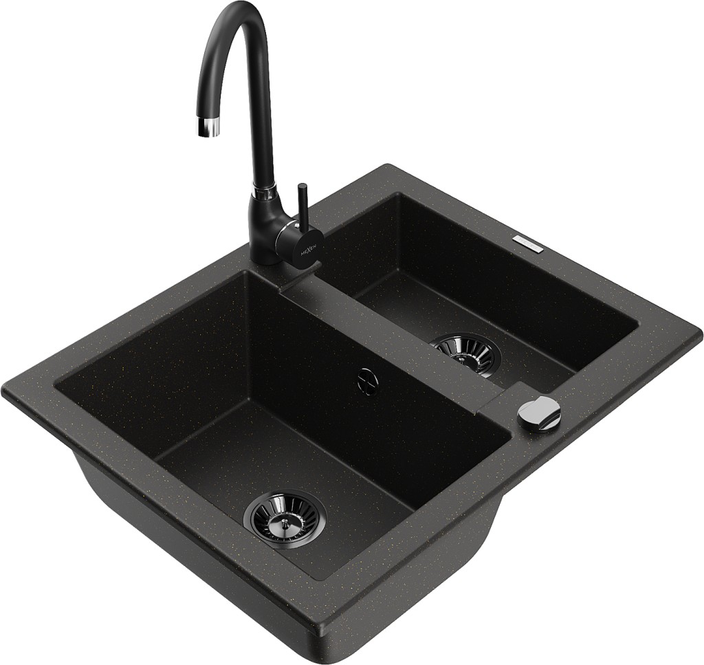 Technické dáta: drez: Rozmer: 582 x 475 x 177 mm Hĺbka komory: 162 mm (väčšia), 102 mm (menšia) Rozmery komory: 395x272 mm (väčšie), 375x182 mm (menšie) Priemer odtoku: ø90 mm Typ: 1,5 komory Typ: Zapustené do pracovnej dosky Farba: čierna / zlatá metalíza Povrchová úprava sifónu: čierna Materiál: žula (80% žulové kamenivo, 20% živice) Prepadový otvor: Áno Otvory: (batérie, automatické) 2 Vysoká odolnosť proti poškriabaniu a zmene farby Odolnosť proti tepelným šokom Ľahko čistiteľný povrch Jeden dodatočný vyfrézovaný otvor na samodierovanie ø35 kuchynská batéria: Materiál: mosadz Čierna farba Hlava: Keramická Prevzdušňovač: Áno Typ: Jedna páka Výška batérie: 335 mm Rozsah výtoku: 180 mm(GT) Ean: 5905315016782