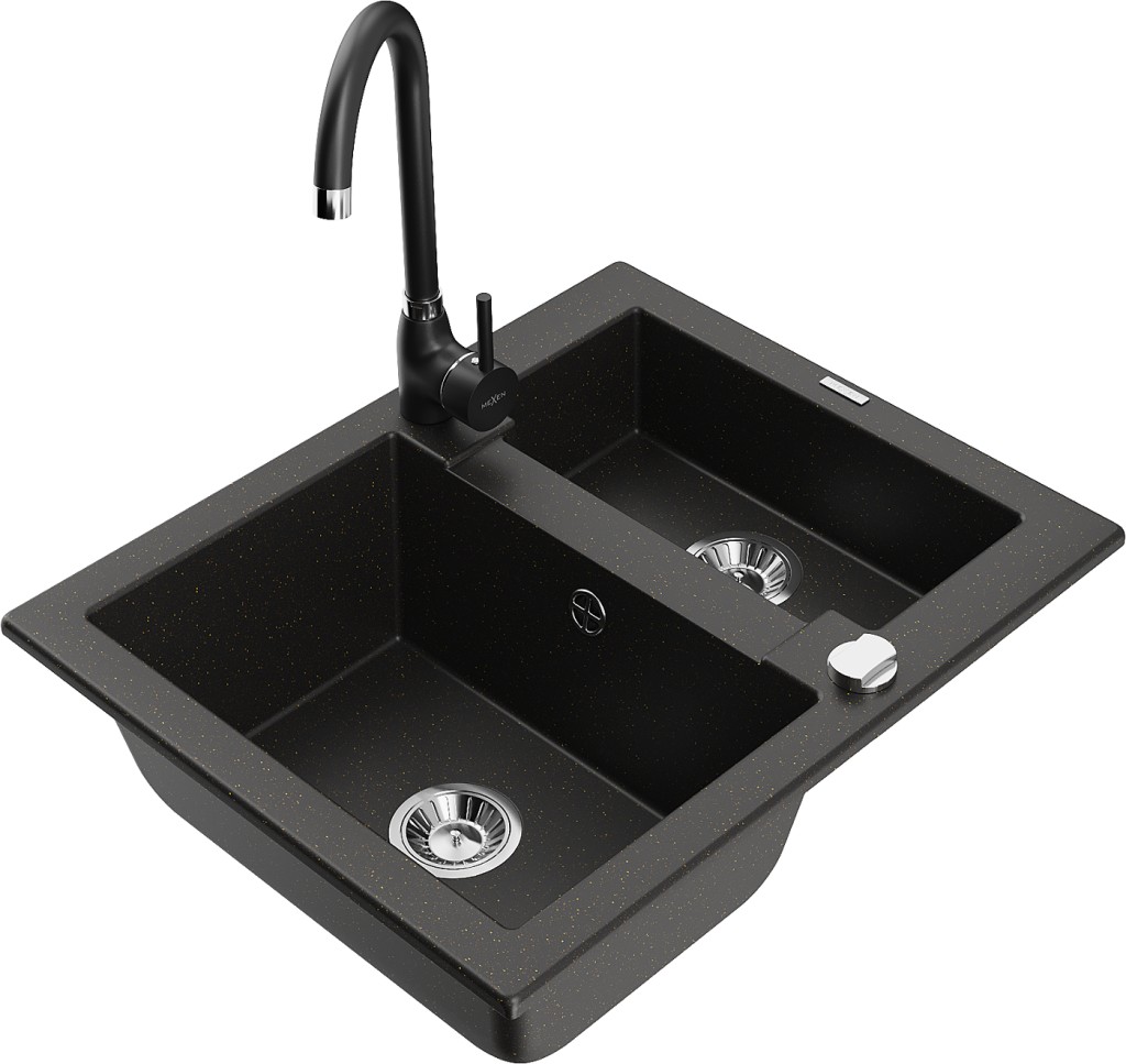 Technické dáta: drez: Rozmer: 582 x 475 x 177 mm Hĺbka komory: 162 mm (väčšia), 102 mm (menšia) Rozmery komory: 395x272 mm (väčšie), 375x182 mm (menšie) Priemer odtoku: ø90 mm Typ: 1,5 komory Typ: Zapustené do pracovnej dosky Farba: čierna / zlatá metalíza Povrchová úprava sifónu: Chrome Materiál: žula (80% žulové kamenivo, 20% živice) Prepadový otvor: Áno Otvory: (batérie, automatické) 2 Vysoká odolnosť proti poškriabaniu a zmene farby Odolnosť proti tepelným šokom Ľahko čistiteľný povrch Jeden dodatočný vyfrézovaný otvor na samodierovanie ø35 kuchynská batéria: Materiál: mosadz Čierna farba Hlava: Keramická Prevzdušňovač: Áno Typ: Jedna páka Výška batérie: 335 mm Rozsah výtoku: 180 mm(GT) Ean: 5905315016775