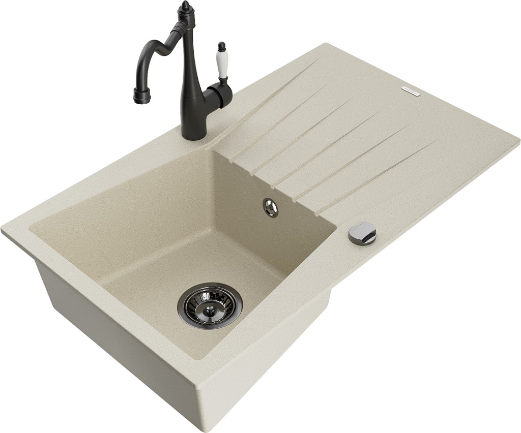 Technické dáta: drez: Rozmer: 775x470x200mm Hĺbka komory: 180 mm Rozmery komory: 410x355 mm Priemer odtoku: ø90 mm Typ: 1-miska s odkvapkávačom Typ: Zapustené do pracovnej dosky Farba béžová Povrchová úprava sifónu: čierna Materiál: žula (80% žulové kamenivo, 20% živice) Prepadový otvor: Áno Otvory: (batérie, automatické) 2 Inštalácia: Univerzálna, je možné inštalovať s odkvapkávačom na ľavú alebo pravú stranu Vysoká odolnosť proti poškriabaniu a zmene farby Odolnosť proti tepelným šokom Ľahko čistiteľný povrch kuchynská batéria: Materiál: mosadz Čierna farba Hlava: Keramická Prevzdušňovač: Áno Typ: Jedna páka Výška batérie: 290 mm Rozsah výtoku: 260 mm(GT) Ean: 5905315040978