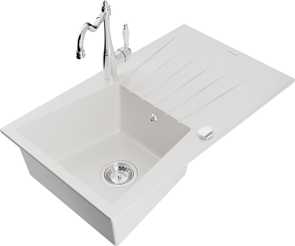Technické dáta: drez: Rozmer: 775x470x200mm Hĺbka komory: 180 mm Rozmery komory: 410x355 mm Priemer odtoku: ø90 mm Typ: 1-miska s odkvapkávačom Typ: Zapustené do pracovnej dosky biela farba Povrchová úprava sifónu: Chrome Materiál: žula (80% žulové kamenivo, 20% živice) Prepadový otvor: Áno Otvory: (batérie, automatické) 2 Inštalácia: Univerzálna, je možné inštalovať s odkvapkávačom na ľavú alebo pravú stranu Vysoká odolnosť proti poškriabaniu a zmene farby Odolnosť proti tepelným šokom Ľahko čistiteľný povrch kuchynská batéria: Materiál: mosadz Farba: Chrome Hlava: Keramická Prevzdušňovač: Áno Typ: Jedna páka Výška batérie: 290 mm Rozsah výtoku: 260 mm(GT) Ean: 5905315040909
