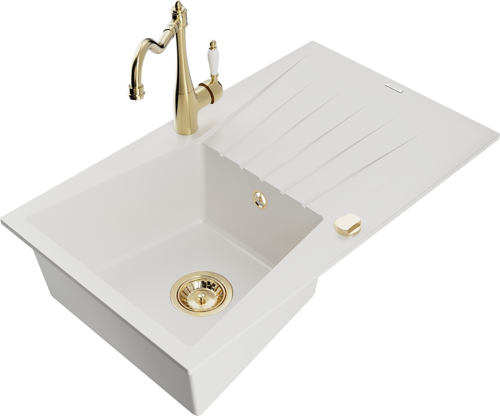 Technické dáta: drez: Rozmer: 775x470x200mm Hĺbka komory: 180 mm Rozmery komory: 410x355 mm Priemer odtoku: ø90 mm Typ: 1-miska s odkvapkávačom Typ: Zapustené do pracovnej dosky biela farba Povrchová úprava sifónu: zlatá Materiál: žula (80% žulové kamenivo, 20% živice) Prepadový otvor: Áno Otvory: (batérie, automatické) 2 Inštalácia: Univerzálna, je možné inštalovať s odkvapkávačom na ľavú alebo pravú stranu Vysoká odolnosť proti poškriabaniu a zmene farby Odolnosť proti tepelným šokom Ľahko čistiteľný povrch kuchynská batéria: Materiál: mosadz Farba: Zlatá Hlava: Keramická Prevzdušňovač: Áno Typ: Jedna páka Výška batérie: 290 mm Rozsah výtoku: 260 mm(GT) Ean: 5905315040923