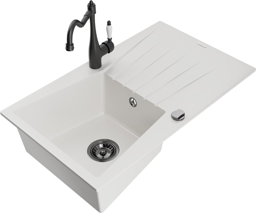 Technické dáta: drez: Rozmer: 775x470x200mm Hĺbka komory: 180 mm Rozmery komory: 410x355 mm Priemer odtoku: ø90 mm Typ: 1-miska s odkvapkávačom Typ: Zapustené do pracovnej dosky biela farba Povrchová úprava sifónu: čierna Materiál: žula (80% žulové kamenivo, 20% živice) Prepadový otvor: Áno Otvory: (batérie, automatické) 2 Inštalácia: Univerzálna, je možné inštalovať s odkvapkávačom na ľavú alebo pravú stranu Vysoká odolnosť proti poškriabaniu a zmene farby Odolnosť proti tepelným šokom Ľahko čistiteľný povrch kuchynská batéria: Materiál: mosadz Čierna farba Hlava: Keramická Prevzdušňovač: Áno Typ: Jedna páka Výška batérie: 290 mm Rozsah výtoku: 260 mm(GT) Ean: 5905315040930