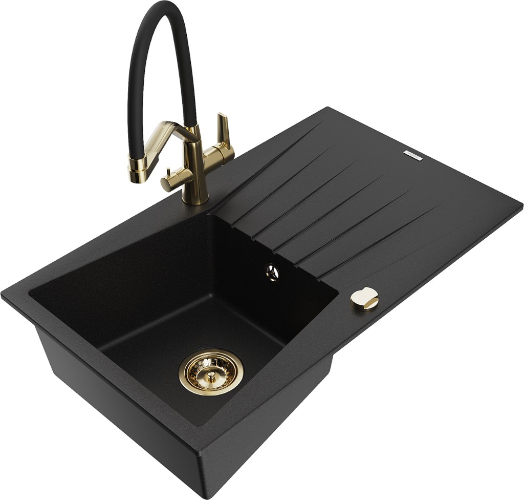 Technické dáta: drez: Rozmer: 775x470x200mm Hĺbka komory: 180 mm Rozmery komory: 410x355 mm Priemer odtoku: ø90 mm Typ: 1-miska s odkvapkávačom Typ: Zapustené do pracovnej dosky Čierna farba Povrchová úprava sifónu: zlatá Materiál: žula (80% žulové kamenivo, 20% živice) Prepadový otvor: Áno Otvory: (batérie, automatické) 2 Inštalácia: Univerzálna, je možné inštalovať s odkvapkávačom na ľavú alebo pravú stranu Vysoká odolnosť proti poškriabaniu a zmene farby Odolnosť proti tepelným šokom Ľahko čistiteľný povrch kuchynská batéria: Materiál: mosadz Farba: Zlatá/Čierna Hlavy: Keramické Prevzdušňovač: Áno Typ hubica: Flexibilný s mosadzným držiakom Rozsah výtoku: 260 mm Výška: 405 mm Typ: Dve rukoväte Dvojhlavá batéria s prídavným filtrom na pitnú vodu(GT) Ean: 5905315102577