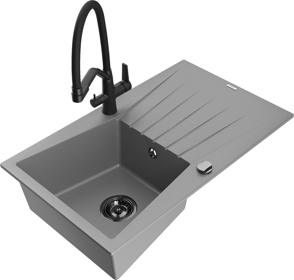 Technické dáta: drez: Rozmer: 775x470x200mm Hĺbka komory: 180 mm Rozmery komory: 410x355 mm Priemer odtoku: ø90 mm Typ: 1-miska s odkvapkávačom Typ: Zapustené do pracovnej dosky Šedá farba Povrchová úprava sifónu: čierna Materiál: žula (80% žulové kamenivo, 20% živice) Prepadový otvor: Áno Otvory: (batérie, automatické) 2 Inštalácia: Univerzálna, je možné inštalovať s odkvapkávačom na ľavú alebo pravú stranu Vysoká odolnosť proti poškriabaniu a zmene farby Odolnosť proti tepelným šokom Ľahko čistiteľný povrch kuchynská batéria: Materiál: mosadz Čierna farba Hlavy: Keramické Prevzdušňovač: Áno Typ hubica: Flexibilný s mosadzným držiakom Rozsah výtoku: 260 mm Výška: 405 mm Typ: Dve rukoväte Dvojhlavá batéria s prídavným filtrom na pitnú vodu(GT) Ean: 5905315102393