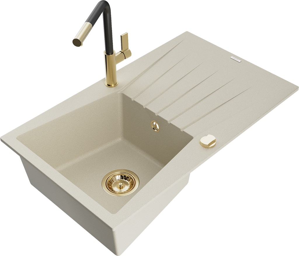 Technické dáta: drez: Rozmer: 775x470x200mm Hĺbka komory: 180 mm Rozmery komory: 410x355 mm Priemer odtoku: ø90 mm Typ: 1-miska s odkvapkávačom Typ: Zapustené do pracovnej dosky Farba béžová Povrchová úprava sifónu: zlatá Materiál: žula (80% žulové kamenivo, 20% živice) Prepadový otvor: Áno Otvory: (batérie, automatické) 2 Inštalácia: Univerzálna, je možné inštalovať s odkvapkávačom na ľavú alebo pravú stranu Vysoká odolnosť proti poškriabaniu a zmene farby Odolnosť proti tepelným šokom Ľahko čistiteľný povrch kuchynská batéria: Materiál: mosadz Farba: Zlatá/Čierna Hlava: Keramická Prevzdušňovač: Áno Typ: Jedna páka Rozsah výtoku: 245 mm Výška batérie: 307 mm(GT) Ean: 5905315061577
