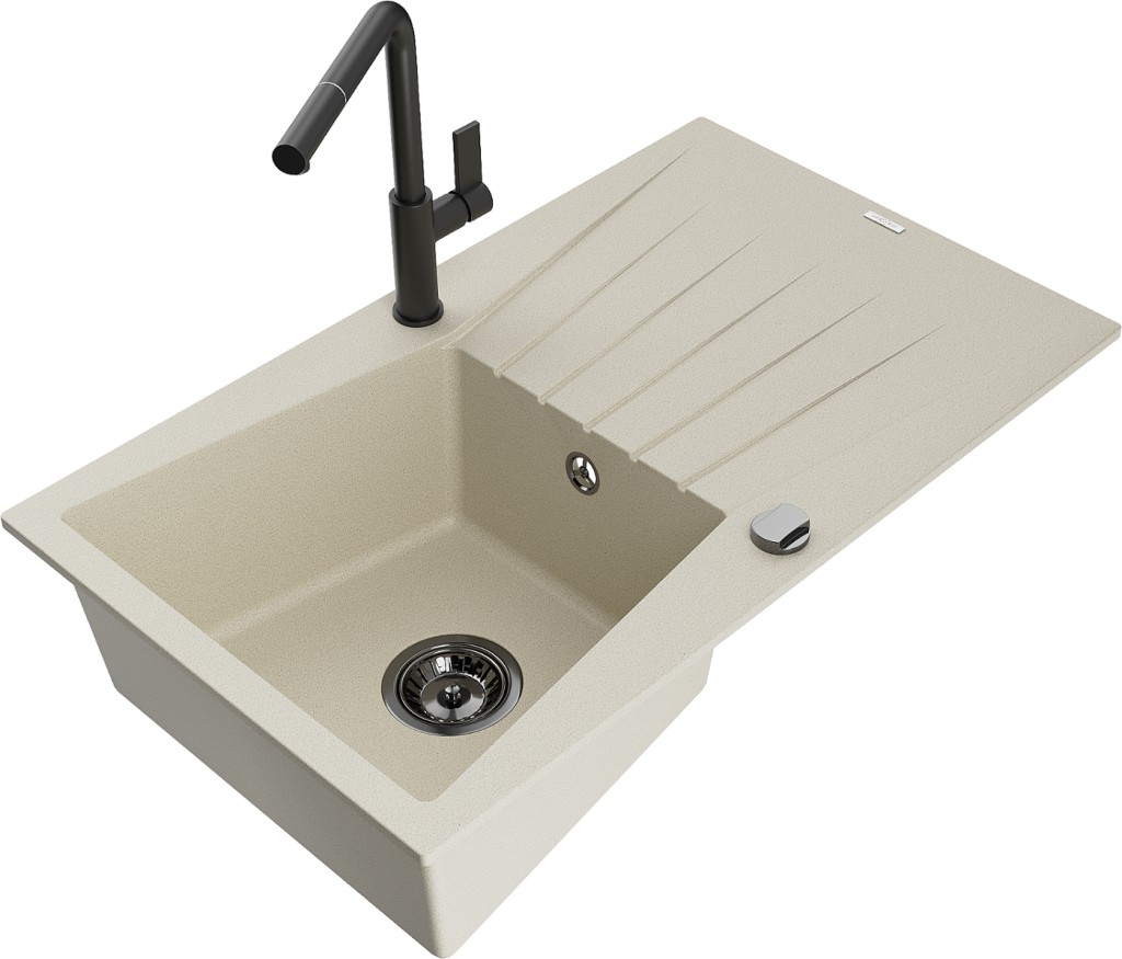 Technické dáta: drez: Rozmer: 775x470x200mm Hĺbka komory: 180 mm Rozmery komory: 410x355 mm Priemer odtoku: ø90 mm Typ: 1-miska s odkvapkávačom Typ: Zapustené do pracovnej dosky Farba béžová Povrchová úprava sifónu: čierna Materiál: žula (80% žulové kamenivo, 20% živice) Prepadový otvor: Áno Otvory: (batérie, automatické) 2 Inštalácia: Univerzálna, je možné inštalovať s odkvapkávačom na ľavú alebo pravú stranu Vysoká odolnosť proti poškriabaniu a zmene farby Odolnosť proti tepelným šokom Ľahko čistiteľný povrch kuchynská batéria: Materiál: mosadz Čierna farba Hlava: Keramická Prevzdušňovač: Áno Typ: Jedna páka Rozsah výtoku: 245 mm Výška batérie: 307 mm(GT) Ean: 5905315061591