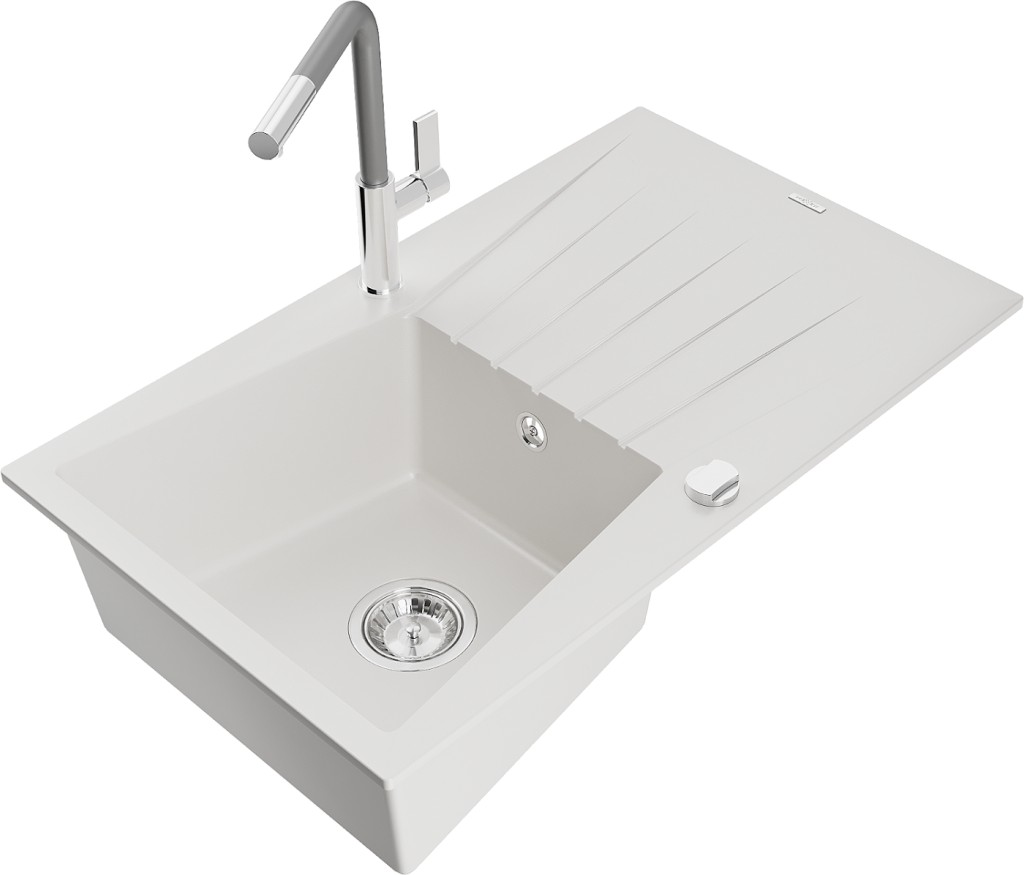 Technické dáta: drez: Rozmer: 775x470x200mm Hĺbka komory: 180 mm Rozmery komory: 410x355 mm Priemer odtoku: ø90 mm Typ: 1-miska s odkvapkávačom Typ: Zapustené do pracovnej dosky biela farba Povrchová úprava sifónu: Chrome Materiál: žula (80% žulové kamenivo, 20% živice) Prepadový otvor: Áno Otvory: (batérie, automatické) 2 Inštalácia: Univerzálna, je možné inštalovať s odkvapkávačom na ľavú alebo pravú stranu Vysoká odolnosť proti poškriabaniu a zmene farby Odolnosť proti tepelným šokom Ľahko čistiteľný povrch kuchynská batéria: Materiál: mosadz Farba: chróm/sivá Hlava: Keramická Prevzdušňovač: Áno Typ: Jedna páka Rozsah výtoku: 245 mm Výška batérie: 307 mm(GT) Ean: 5905315061478