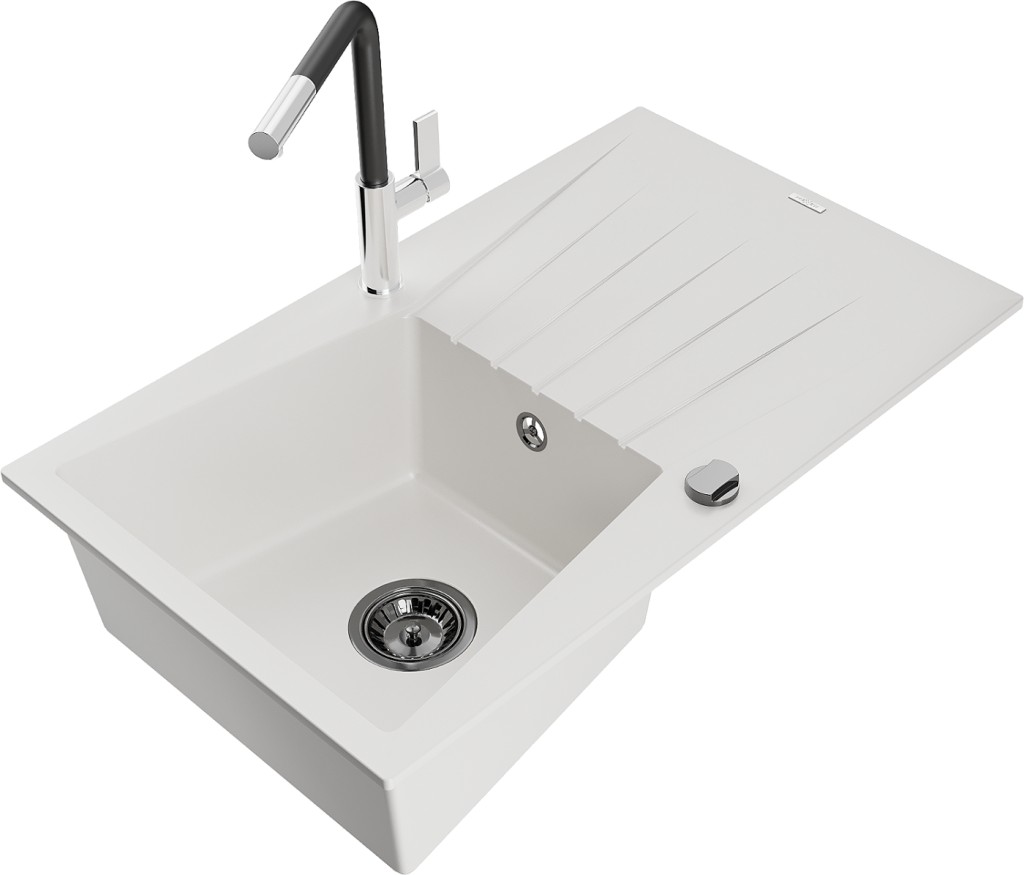 Technické dáta: drez: Rozmer: 775x470x200mm Hĺbka komory: 180 mm Rozmery komory: 410x355 mm Priemer odtoku: ø90 mm Typ: 1-miska s odkvapkávačom Typ: Zapustené do pracovnej dosky biela farba Povrchová úprava sifónu: čierna Materiál: žula (80% žulové kamenivo, 20% živice) Prepadový otvor: Áno Otvory: (batérie, automatické) 2 Inštalácia: Univerzálna, je možné inštalovať s odkvapkávačom na ľavú alebo pravú stranu Vysoká odolnosť proti poškriabaniu a zmene farby Odolnosť proti tepelným šokom Ľahko čistiteľný povrch kuchynská batéria: Materiál: mosadz Farba: chróm/čierna Hlava: Keramická Prevzdušňovač: Áno Typ: Jedna páka Rozsah výtoku: 245 mm Výška batérie: 307 mm(GT) Ean: 5905315061492