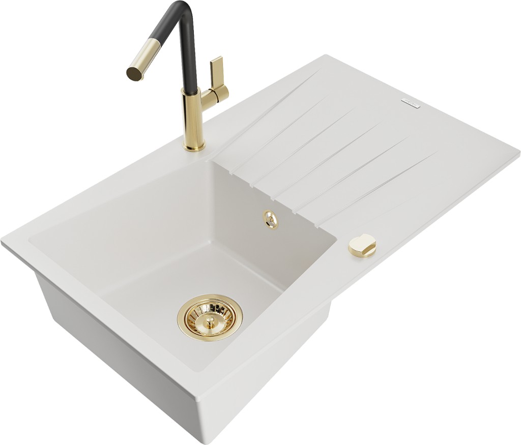 Technické dáta: drez: Rozmer: 775x470x200mm Hĺbka komory: 180 mm Rozmery komory: 410x355 mm Priemer odtoku: ø90 mm Typ: 1-miska s odkvapkávačom Typ: Zapustené do pracovnej dosky biela farba Povrchová úprava sifónu: zlatá Materiál: žula (80% žulové kamenivo, 20% živice) Prepadový otvor: Áno Otvory: (batérie, automatické) 2 Inštalácia: Univerzálna, je možné inštalovať s odkvapkávačom na ľavú alebo pravú stranu Vysoká odolnosť proti poškriabaniu a zmene farby Odolnosť proti tepelným šokom Ľahko čistiteľný povrch kuchynská batéria: Materiál: mosadz Farba: Zlatá/Čierna Hlava: Keramická Prevzdušňovač: Áno Typ: Jedna páka Rozsah výtoku: 245 mm Výška batérie: 307 mm(GT) Ean: 5905315061508