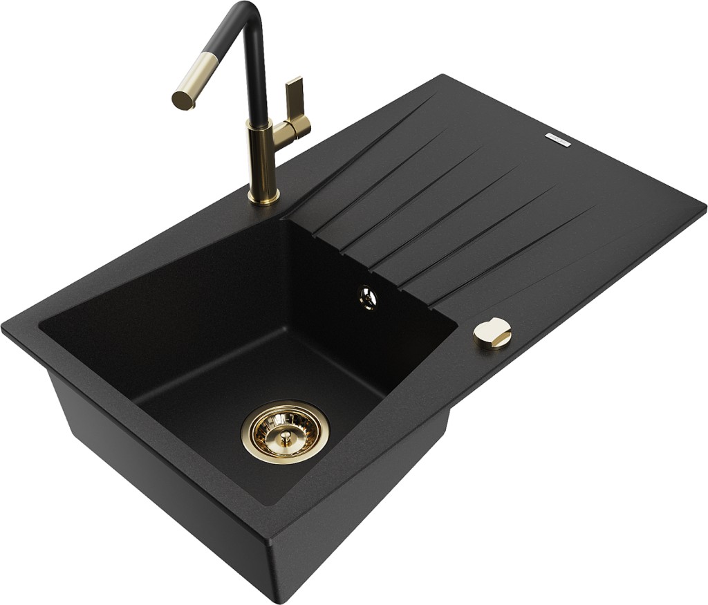 Technické dáta: drez: Rozmer: 775x470x200mm Hĺbka komory: 180 mm Rozmery komory: 410x355 mm Priemer odtoku: ø90 mm Typ: 1-miska s odkvapkávačom Typ: Zapustené do pracovnej dosky Čierna farba Povrchová úprava sifónu: zlatá Materiál: žula (80% žulové kamenivo, 20% živice) Prepadový otvor: Áno Otvory: (batérie, automatické) 2 Inštalácia: Univerzálna, je možné inštalovať s odkvapkávačom na ľavú alebo pravú stranu Vysoká odolnosť proti poškriabaniu a zmene farby Odolnosť proti tepelným šokom Ľahko čistiteľný povrch kuchynská batéria: Materiál: mosadz Farba: Zlatá/Čierna Hlava: Keramická Prevzdušňovač: Áno Typ: Jedna páka Rozsah výtoku: 245 mm Výška batérie: 307 mm(GT) Ean: 5905315061928