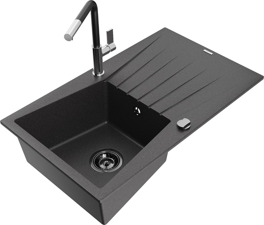 Technické dáta: drez: Rozmer: 775x470x200mm Hĺbka komory: 180 mm Rozmery komory: 410x355 mm Priemer odtoku: ø90 mm Typ: 1-miska s odkvapkávačom Typ: Zapustené do pracovnej dosky Farba: Škvrnitá čierna Povrchová úprava sifónu: čierna Materiál: žula (80% žulové kamenivo, 20% živice) Prepadový otvor: Áno Otvory: (batérie, automatické) 2 Inštalácia: Univerzálna, je možné inštalovať s odkvapkávačom na ľavú alebo pravú stranu Vysoká odolnosť proti poškriabaniu a zmene farby Odolnosť proti tepelným šokom Ľahko čistiteľný povrch kuchynská batéria: Materiál: mosadz Farba: chróm/čierna Hlava: Keramická Prevzdušňovač: Áno Typ: Jedna páka Rozsah výtoku: 245 mm Výška batérie: 307 mm(GT) Ean: 5905315061812