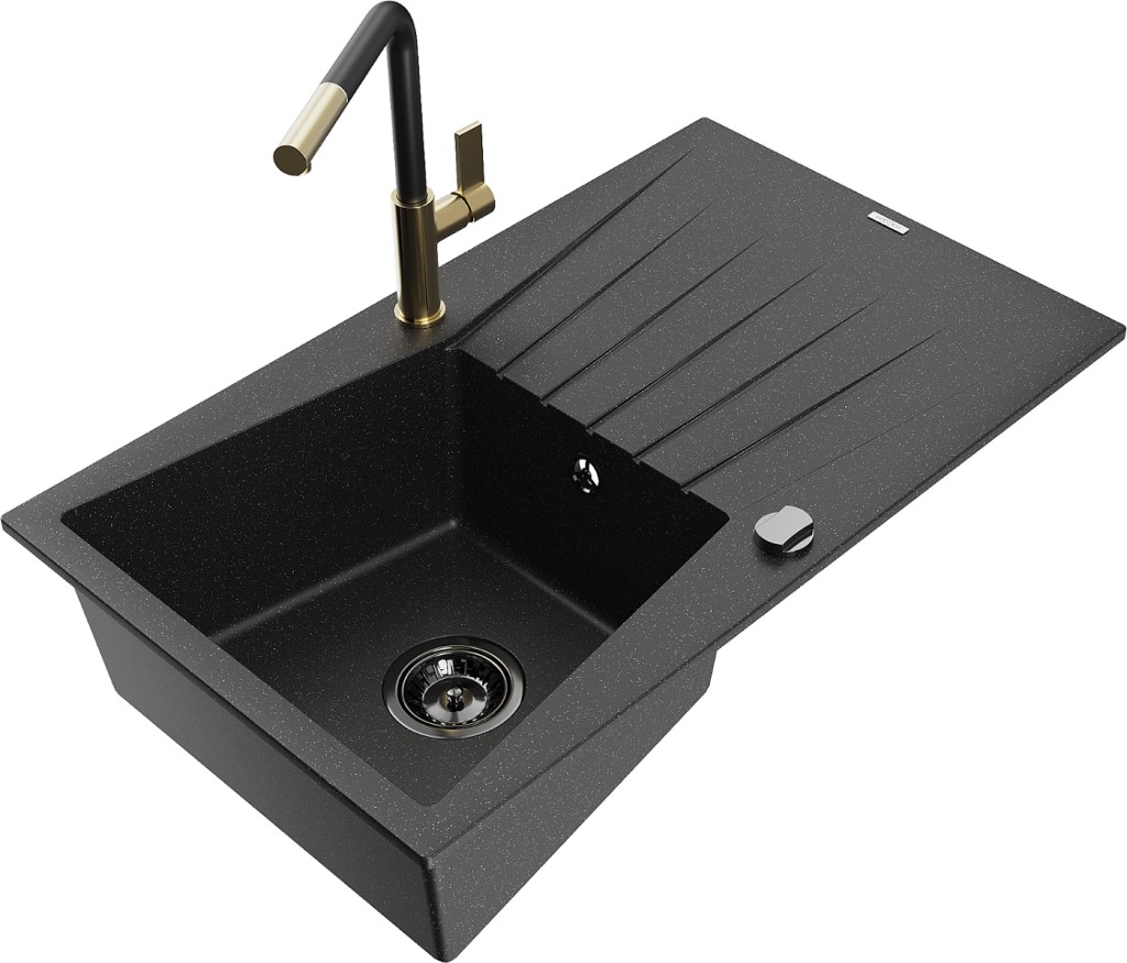 Technické dáta: drez: Rozmer: 775x470x200mm Hĺbka komory: 180 mm Rozmery komory: 410x355 mm Priemer odtoku: ø90 mm Typ: 1-miska s odkvapkávačom Typ: Zapustené do pracovnej dosky Farba: čierna/strieborná metalíza Povrchová úprava sifónu: čierna Materiál: žula (80% žulové kamenivo, 20% živice) Prepadový otvor: Áno Otvory: (batérie, automatické) 2 Inštalácia: Univerzálna, je možné inštalovať s odkvapkávačom na ľavú alebo pravú stranu Vysoká odolnosť proti poškriabaniu a zmene farby Odolnosť proti tepelným šokom Ľahko čistiteľný povrch kuchynská batéria: Materiál: mosadz Farba: Zlatá/Čierna Hlava: Keramická Prevzdušňovač: Áno Typ: Jedna páka Rozsah výtoku: 245 mm Výška batérie: 307 mm(GT) Ean: 5905315061713