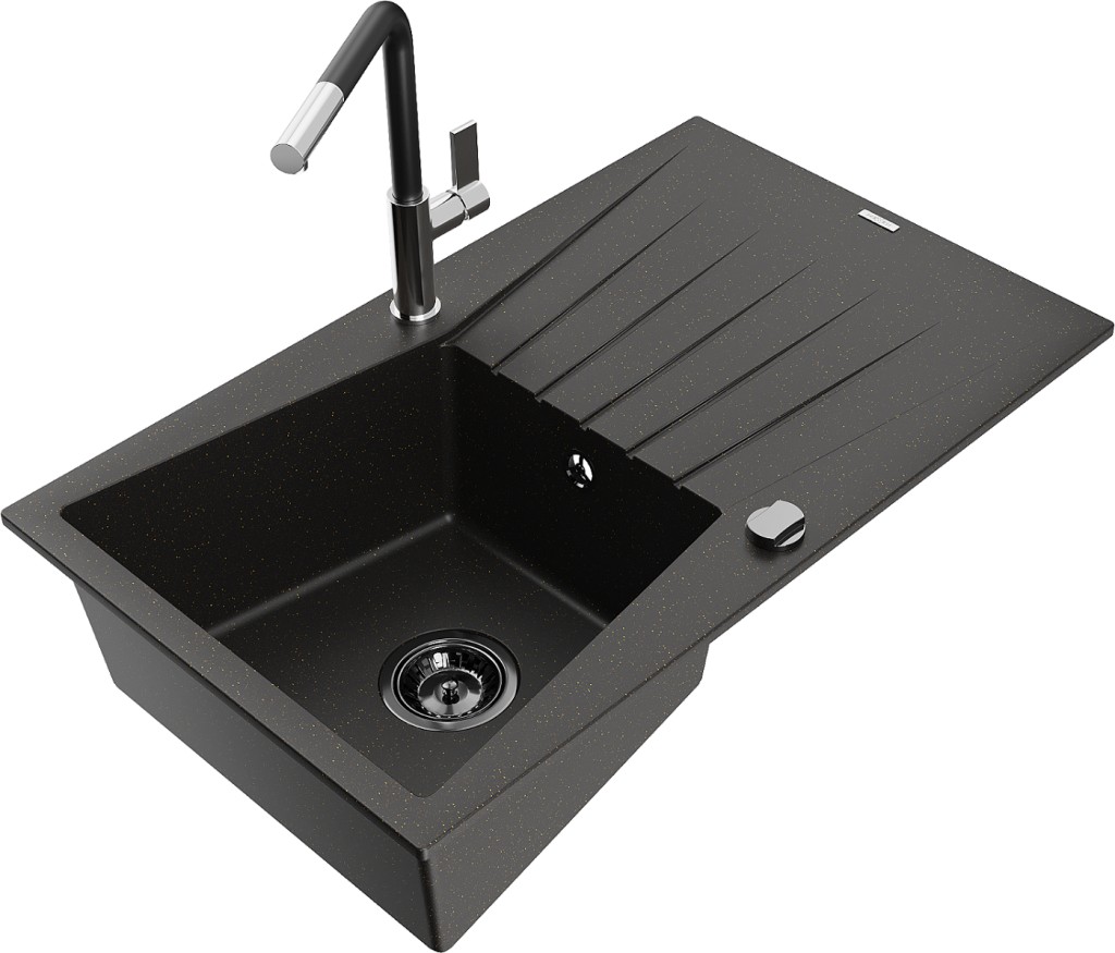 Technické dáta: drez: Rozmer: 775x470x200mm Hĺbka komory: 180 mm Rozmery komory: 410x355 mm Priemer odtoku: ø90 mm Typ: 1-miska s odkvapkávačom Typ: Zapustené do pracovnej dosky Farba: čierna / zlatá metalíza Povrchová úprava sifónu: čierna Materiál: žula (80% žulové kamenivo, 20% živice) Prepadový otvor: Áno Otvory: (batérie, automatické) 2 Inštalácia: Univerzálna, je možné inštalovať s odkvapkávačom na ľavú alebo pravú stranu Vysoká odolnosť proti poškriabaniu a zmene farby Odolnosť proti tepelným šokom Ľahko čistiteľný povrch kuchynská batéria: Materiál: mosadz Farba: chróm/čierna Hlava: Keramická Prevzdušňovač: Áno Typ: Jedna páka Rozsah výtoku: 245 mm Výška batérie: 307 mm(GT) Ean: 5905315061751