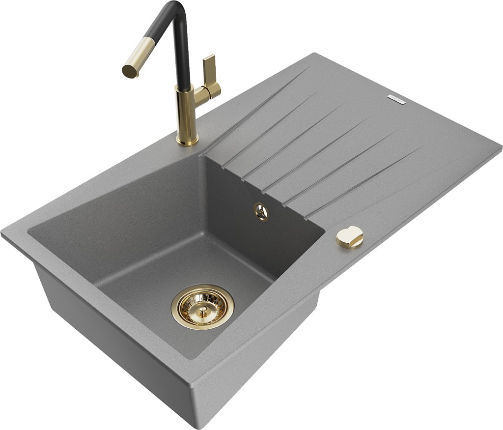 Technické dáta: drez: Rozmer: 775x470x200mm Hĺbka komory: 180 mm Rozmery komory: 410x355 mm Priemer odtoku: ø90 mm Typ: 1-miska s odkvapkávačom Typ: Zapustené do pracovnej dosky Šedá farba Povrchová úprava sifónu: zlatá Materiál: žula (80% žulové kamenivo, 20% živice) Prepadový otvor: Áno Otvory: (batérie, automatické) 2 Inštalácia: Univerzálna, je možné inštalovať s odkvapkávačom na ľavú alebo pravú stranu Vysoká odolnosť proti poškriabaniu a zmene farby Odolnosť proti tepelným šokom Ľahko čistiteľný povrch kuchynská batéria: Materiál: mosadz Farba: Zlatá/Čierna Hlava: Keramická Prevzdušňovač: Áno Typ: Jedna páka Rozsah výtoku: 245 mm Výška batérie: 307 mm(GT) Ean: 5905315061645