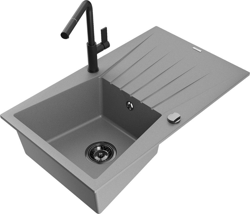 Technické dáta: drez: Rozmer: 775x470x200mm Hĺbka komory: 180 mm Rozmery komory: 410x355 mm Priemer odtoku: ø90 mm Typ: 1-miska s odkvapkávačom Typ: Zapustené do pracovnej dosky Šedá farba Povrchová úprava sifónu: čierna Materiál: žula (80% žulové kamenivo, 20% živice) Prepadový otvor: Áno Otvory: (batérie, automatické) 2 Inštalácia: Univerzálna, je možné inštalovať s odkvapkávačom na ľavú alebo pravú stranu Vysoká odolnosť proti poškriabaniu a zmene farby Odolnosť proti tepelným šokom Ľahko čistiteľný povrch kuchynská batéria: Materiál: mosadz Čierna farba Hlava: Keramická Prevzdušňovač: Áno Typ: Jedna páka Rozsah výtoku: 245 mm Výška batérie: 307 mm(GT) Ean: 5905315061669