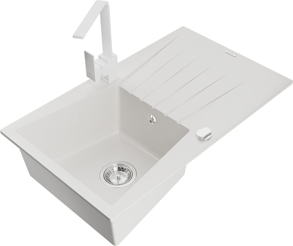 Technické dáta: drez: Rozmer: 775x470x200mm Hĺbka komory: 180 mm Rozmery komory: 410x355 mm Priemer odtoku: ø90 mm Typ: 1-miska s odkvapkávačom Typ: Zapustené do pracovnej dosky biela farba Povrchová úprava sifónu: Chrome Materiál: žula (80% žulové kamenivo, 20% živice) Prepadový otvor: Áno Otvory: (batérie, automatické) 2 Inštalácia: Univerzálna, je možné inštalovať s odkvapkávačom na ľavú alebo pravú stranu Vysoká odolnosť proti poškriabaniu a zmene farby Odolnosť proti tepelným šokom Ľahko čistiteľný povrch kuchynská batéria: Materiál: mosadz biela farba Hlava: Keramická Prevzdušňovač: Áno Typ: Jedna páka Výška batérie: 290 mm Rozsah výtoku: 220 mm(GT) Ean: 5905315020420