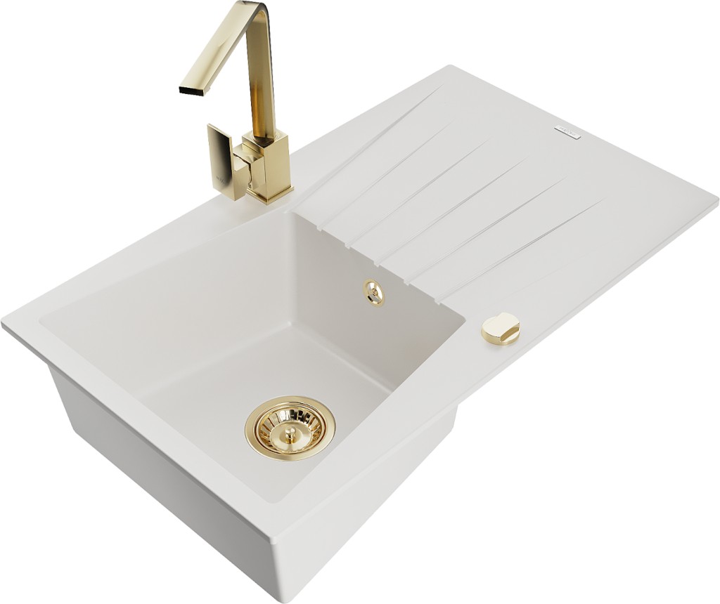 Technické dáta: drez: Rozmer: 775x470x200mm Hĺbka komory: 180 mm Rozmery komory: 410x355 mm Priemer odtoku: ø90 mm Typ: 1-miska s odkvapkávačom Typ: Zapustené do pracovnej dosky biela farba Povrchová úprava sifónu: zlatá Materiál: žula (80% žulové kamenivo, 20% živice) Prepadový otvor: Áno Otvory: (batérie, automatické) 2 Inštalácia: Univerzálna, je možné inštalovať s odkvapkávačom na ľavú alebo pravú stranu Vysoká odolnosť proti poškriabaniu a zmene farby Odolnosť proti tepelným šokom Ľahko čistiteľný povrch kuchynská batéria: Materiál: mosadz Farba: Zlatá Hlava: Keramická Prevzdušňovač: Áno Typ: Jedna páka Výška batérie: 290 mm Rozsah výtoku: 220 mm(GT) Ean: 5905315020437