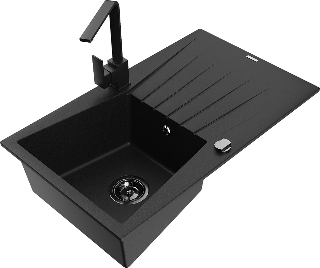 Technické dáta: drez: Rozmer: 775x470x200mm Hĺbka komory: 180 mm Rozmery komory: 410x355 mm Priemer odtoku: ø90 mm Typ: 1-miska s odkvapkávačom Typ: Zapustené do pracovnej dosky Čierna farba Povrchová úprava sifónu: čierna Materiál: žula (80% žulové kamenivo, 20% živice) Prepadový otvor: Áno Otvory: (batérie, automatické) 2 Inštalácia: Univerzálna, je možné inštalovať s odkvapkávačom na ľavú alebo pravú stranu Vysoká odolnosť proti poškriabaniu a zmene farby Odolnosť proti tepelným šokom Ľahko čistiteľný povrch kuchynská batéria: Materiál: mosadz Čierna farba Hlava: Keramická Prevzdušňovač: Áno Typ: Jedna páka Výška batérie: 290 mm Rozsah výtoku: 220 mm(GT) Ean: 5905315020710