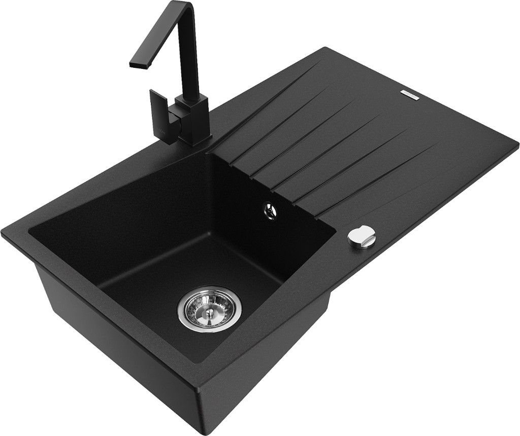 Technické dáta: drez: Rozmer: 775x470x200mm Hĺbka komory: 180 mm Rozmery komory: 410x355 mm Priemer odtoku: ø90 mm Typ: 1-miska s odkvapkávačom Typ: Zapustené do pracovnej dosky Čierna farba Povrchová úprava sifónu: Chrome Materiál: žula (80% žulové kamenivo, 20% živice) Prepadový otvor: Áno Otvory: (batérie, automatické) 2 Inštalácia: Univerzálna, je možné inštalovať s odkvapkávačom na ľavú alebo pravú stranu Vysoká odolnosť proti poškriabaniu a zmene farby Odolnosť proti tepelným šokom Ľahko čistiteľný povrch kuchynská batéria: Materiál: mosadz Čierna farba Hlava: Keramická Prevzdušňovač: Áno Typ: Jedna páka Výška batérie: 300 mm(GT) Ean: 5905315020727