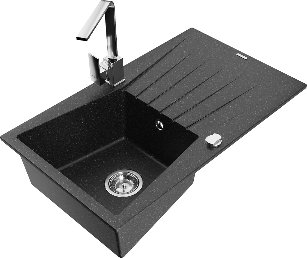 Technické dáta: drez: Rozmer: 775x470x200mm Hĺbka komory: 180 mm Rozmery komory: 410x355 mm Priemer odtoku: ø90 mm Typ: 1-miska s odkvapkávačom Typ: Zapustené do pracovnej dosky Farba: čierna/strieborná metalíza Povrchová úprava sifónu: Chrome Materiál: žula (80% žulové kamenivo, 20% živice) Prepadový otvor: Áno Otvory: (batérie, automatické) 2 Inštalácia: Univerzálna, je možné inštalovať s odkvapkávačom na ľavú alebo pravú stranu Vysoká odolnosť proti poškriabaniu a zmene farby Odolnosť proti tepelným šokom Ľahko čistiteľný povrch kuchynská batéria: Materiál: mosadz Farba: Chrome Hlava: Keramická Prevzdušňovač: Áno Typ: Jedna páka Výška batérie: 290 mm Rozsah výtoku: 220 mm(GT) Ean: 5905315020543