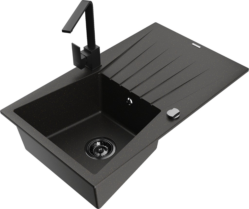 Technické dáta: drez: Rozmer: 775x470x200mm Hĺbka komory: 180 mm Rozmery komory: 410x355 mm Priemer odtoku: ø90 mm Typ: 1-miska s odkvapkávačom Typ: Zapustené do pracovnej dosky Farba: čierna / zlatá metalíza Povrchová úprava sifónu: čierna Materiál: žula (80% žulové kamenivo, 20% živice) Prepadový otvor: Áno Otvory: (batérie, automatické) 2 Inštalácia: Univerzálna, je možné inštalovať s odkvapkávačom na ľavú alebo pravú stranu Vysoká odolnosť proti poškriabaniu a zmene farby Odolnosť proti tepelným šokom Ľahko čistiteľný povrch kuchynská batéria: Materiál: mosadz Čierna farba Hlava: Keramická Prevzdušňovač: Áno Typ: Jedna páka Výška batérie: 290 mm Rozsah výtoku: 220 mm(GT) Ean: 5905315020611