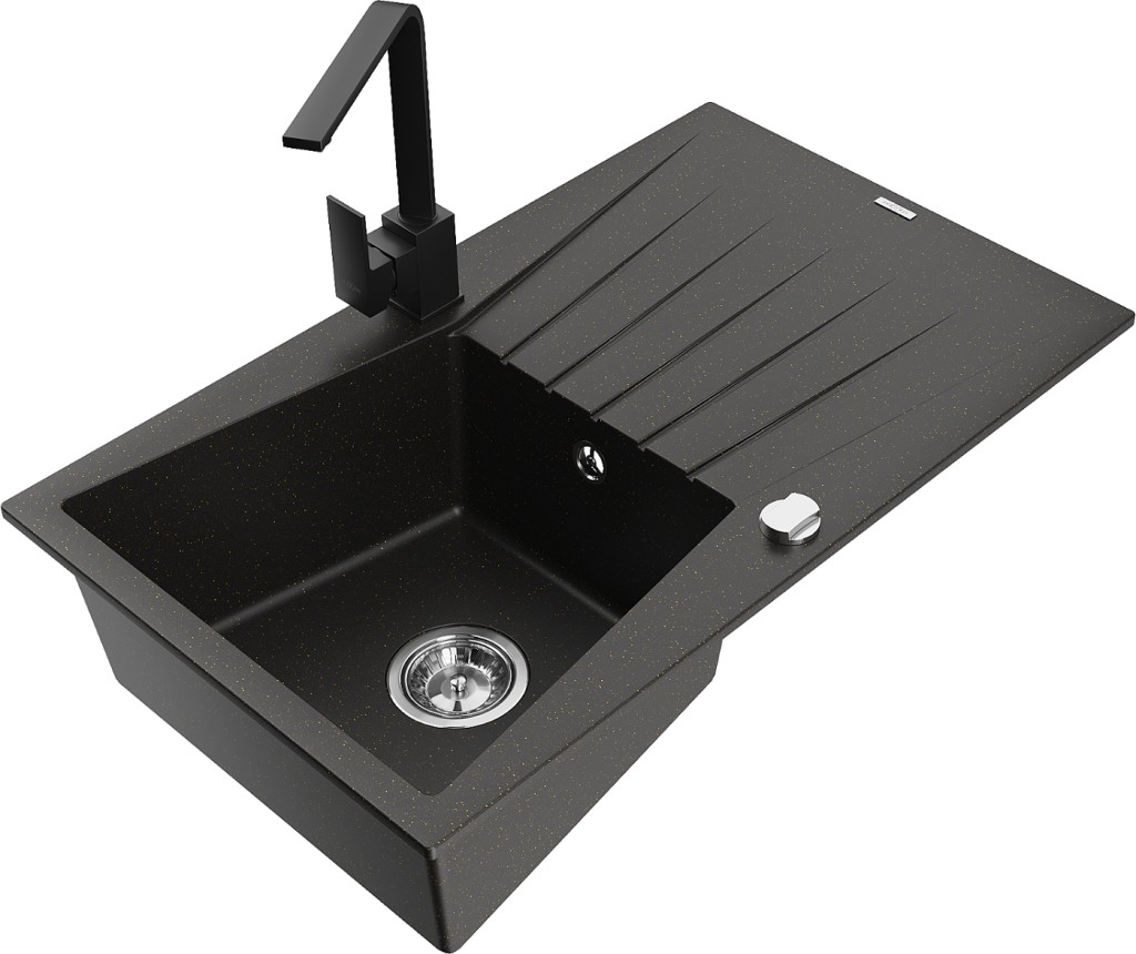 Technické dáta: drez: Rozmer: 775x470x200mm Hĺbka komory: 180 mm Rozmery komory: 410x355 mm Priemer odtoku: ø90 mm Typ: 1-miska s odkvapkávačom Typ: Zapustené do pracovnej dosky Farba: čierna / zlatá metalíza Povrchová úprava sifónu: Chrome Materiál: žula (80% žulové kamenivo, 20% živice) Prepadový otvor: Áno Otvory: (batérie, automatické) 2 Inštalácia: Univerzálna, je možné inštalovať s odkvapkávačom na ľavú alebo pravú stranu Vysoká odolnosť proti poškriabaniu a zmene farby Odolnosť proti tepelným šokom Ľahko čistiteľný povrch kuchynská batéria: Materiál: mosadz Čierna farba Hlava: Keramická Prevzdušňovač: Áno Typ: Jedna páka Výška batérie: 290 mm Rozsah výtoku: 220 mm(GT) Ean: 5905315020628