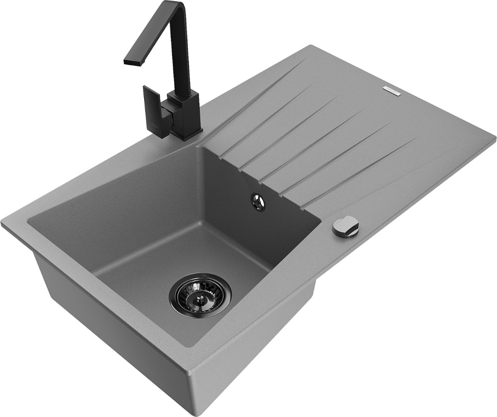 Technické dáta: drez: Rozmer: 775x470x200mm Hĺbka komory: 180 mm Rozmery komory: 410x355 mm Priemer odtoku: ø90 mm Typ: 1-miska s odkvapkávačom Typ: Zapustené do pracovnej dosky Šedá farba Povrchová úprava sifónu: čierna Materiál: žula (80% žulové kamenivo, 20% živice) Prepadový otvor: Áno Otvory: (batérie, automatické) 2 Inštalácia: Univerzálna, je možné inštalovať s odkvapkávačom na ľavú alebo pravú stranu Vysoká odolnosť proti poškriabaniu a zmene farby Odolnosť proti tepelným šokom Ľahko čistiteľný povrch kuchynská batéria: Materiál: mosadz Čierna farba Hlava: Keramická Prevzdušňovač: Áno Typ: Jedna páka Výška batérie: 290 mm Rozsah výtoku: 220 mm(GT) Ean: 5905315020529