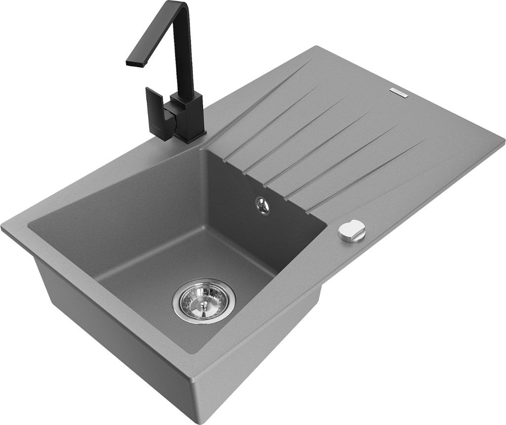Technické dáta: drez: Rozmer: 775x470x200mm Hĺbka komory: 180 mm Rozmery komory: 410x355 mm Priemer odtoku: ø90 mm Typ: 1-miska s odkvapkávačom Typ: Zapustené do pracovnej dosky Šedá farba Povrchová úprava sifónu: Chrome Materiál: žula (80% žulové kamenivo, 20% živice) Prepadový otvor: Áno Otvory: (batérie, automatické) 2 Inštalácia: Univerzálna, je možné inštalovať s odkvapkávačom na ľavú alebo pravú stranu Vysoká odolnosť proti poškriabaniu a zmene farby Odolnosť proti tepelným šokom Ľahko čistiteľný povrch kuchynská batéria: Materiál: mosadz Čierna farba Hlava: Keramická Prevzdušňovač: Áno Typ: Jedna páka Výška batérie: 290 mm Rozsah výtoku: 220 mm(GT) Ean: 5905315020512