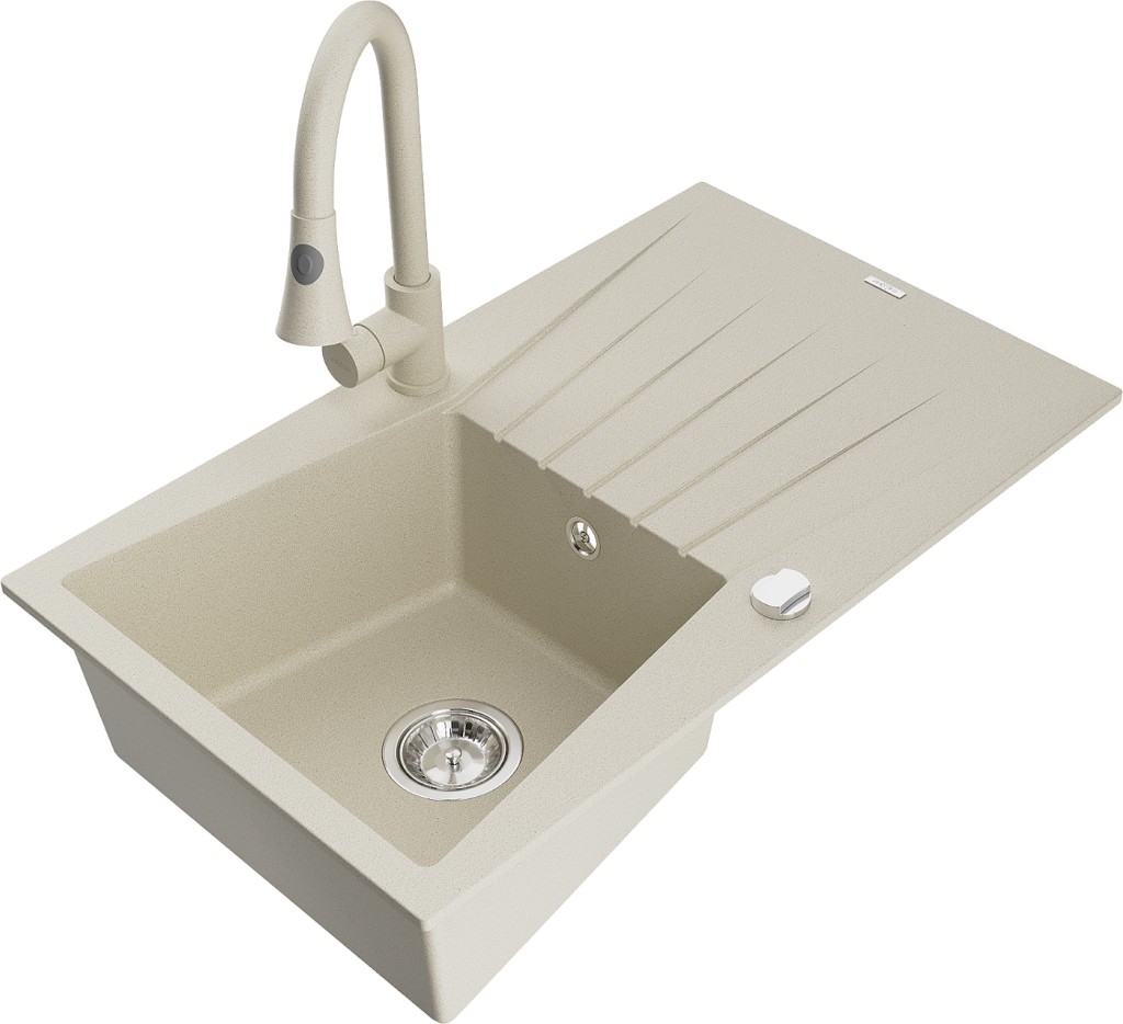 Technické dáta: drez: Rozmer: 775x470x200mm Hĺbka komory: 180 mm Rozmery komory: 410x355 mm Priemer odtoku: ø90 mm Typ: 1-miska s odkvapkávačom Typ: Zapustené do pracovnej dosky Farba béžová Povrchová úprava sifónu: Chrome Materiál: žula (80% žulové kamenivo, 20% živice) Prepadový otvor: Áno Otvory: (batérie, automatické) 2 Inštalácia: Univerzálna, je možné inštalovať s odkvapkávačom na ľavú alebo pravú stranu Vysoká odolnosť proti poškriabaniu a zmene farby Odolnosť proti tepelným šokom Ľahko čistiteľný povrch kuchynská batéria: Materiál: mosadz Farba béžová Hlava: Keramická Prevzdušňovač: Áno Typ: Jedna páka Výška batérie: 380 mm Rozsah výtoku: 252 mm Typ výtoku: Výsuvný(GT) Ean: 5905315030702