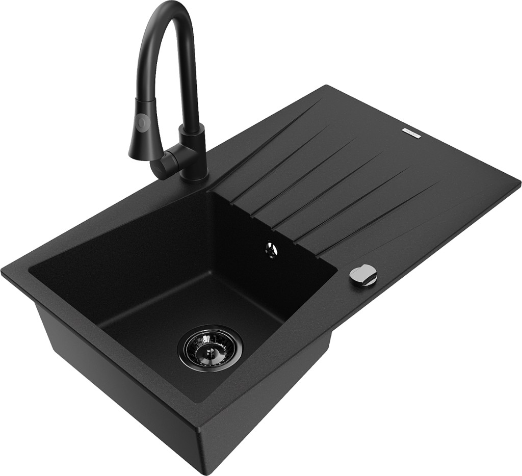 Technické dáta: drez: Rozmer: 775x470x200mm Hĺbka komory: 180 mm Rozmery komory: 410x355 mm Priemer odtoku: ø90 mm Typ: 1-miska s odkvapkávačom Typ: Zapustené do pracovnej dosky Čierna farba Povrchová úprava sifónu: čierna Materiál: žula (80% žulové kamenivo, 20% živice) Prepadový otvor: Áno Otvory: (batérie, automatické) 2 Inštalácia: Univerzálna, je možné inštalovať s odkvapkávačom na ľavú alebo pravú stranu Vysoká odolnosť proti poškriabaniu a zmene farby Odolnosť proti tepelným šokom Ľahko čistiteľný povrch kuchynská batéria: Materiál: mosadz Čierna farba Hlava: Keramická Prevzdušňovač: Áno Typ: Jedna páka Výška batérie: 380 mm Rozsah výtoku: 252 mm Typ výtoku: Výsuvný(GT) Ean: 5905315030955