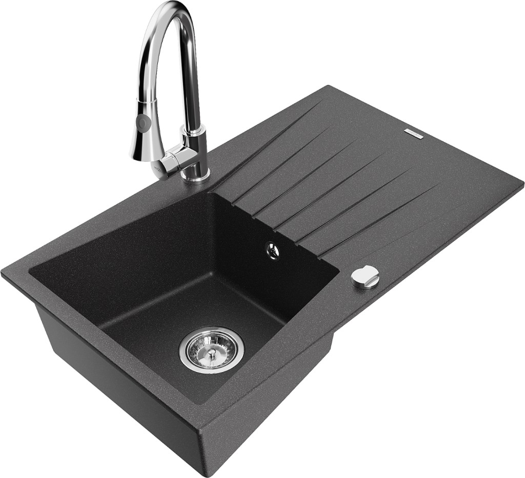 Technické dáta: drez: Rozmer: 775x470x200mm Hĺbka komory: 180 mm Rozmery komory: 410x355 mm Priemer odtoku: ø90 mm Typ: 1-miska s odkvapkávačom Typ: Zapustené do pracovnej dosky Farba: Škvrnitá čierna Povrchová úprava sifónu: Chrome Materiál: žula (80% žulové kamenivo, 20% živice) Prepadový otvor: Áno Otvory: (batérie, automatické) 2 Inštalácia: Univerzálna, je možné inštalovať s odkvapkávačom na ľavú alebo pravú stranu Vysoká odolnosť proti poškriabaniu a zmene farby Odolnosť proti tepelným šokom Ľahko čistiteľný povrch kuchynská batéria: Materiál: mosadz Farba: Chrome Hlava: Keramická Prevzdušňovač: Áno Typ: Jedna páka Výška batérie: 380 mm Rozsah výtoku: 252 mm Typ výtoku: Výsuvný(GT) Ean: 5905315030870